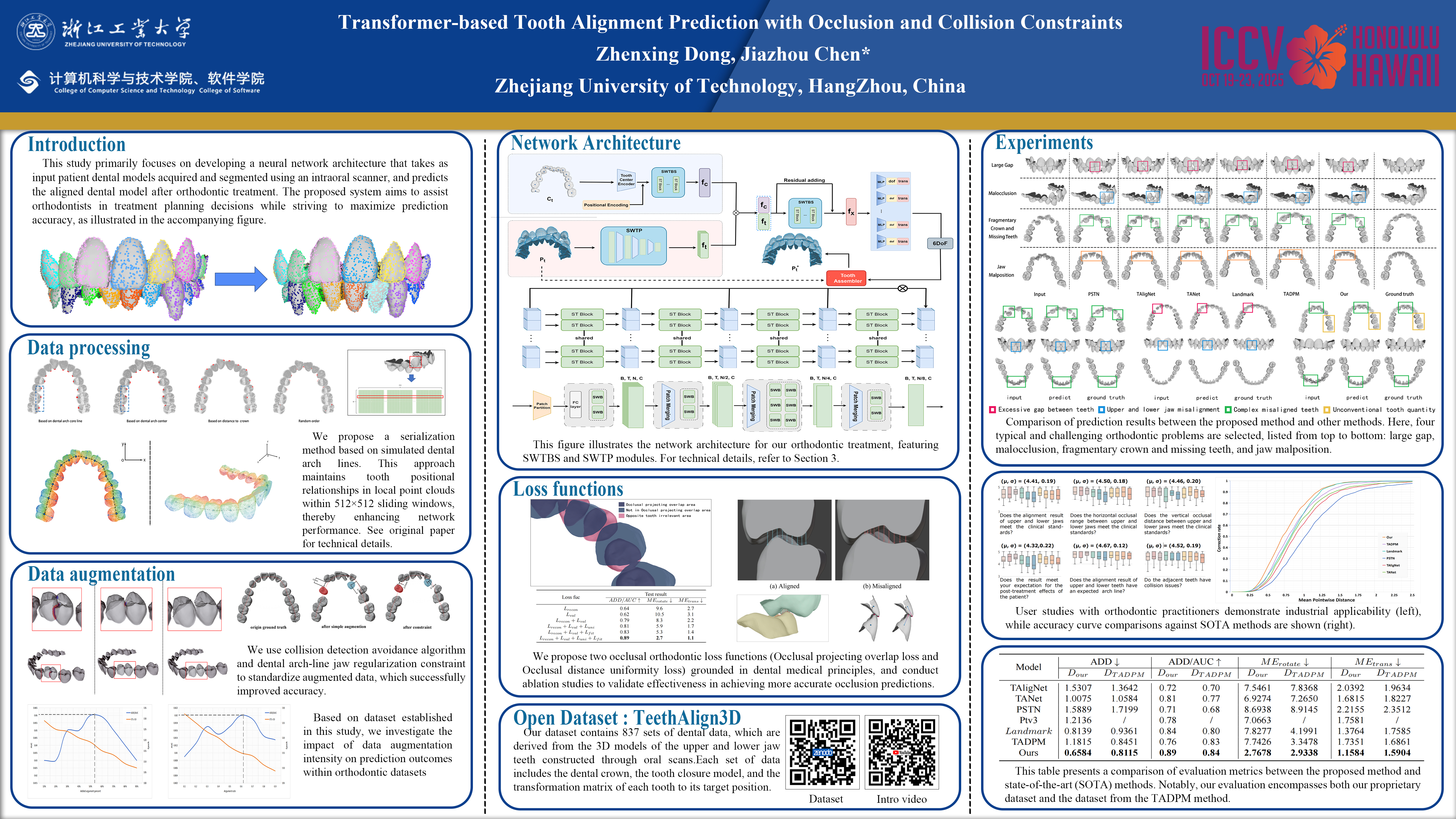 The planning of digital orthodontic treatment requires providing tooth alignment, which relays clinical experiences heavily and consumes a lot of time and labor to determine manually. In this work, we proposed an automatic tooth alignment neural network based on Swin-transformer. We first re-organized 3D point clouds based on dental arch lines and converted them into order-sorted multi-channel textures, improving both accuracy and efficiency. We then designed two new orthodontic loss functions that quantitatively evaluate the occlusal relationship between the upper and lower jaws. They are important clinical constraints, first introduced and lead to cutting-edge prediction accuracy. To train our network, we collected a large digital orthodontic dataset in more than 2 years, including various complex clinical cases. We will release this dataset after the paper's publishment and believe it will benefit the community. Furthermore, we proposed two new orthodontic dataset augmentation methods considering tooth spatial distribution and occlusion. We compared our method with most SOTA methods using this dataset, and extensive ablation studies and experiments demonstrated the high accuracy and efficiency of our method.