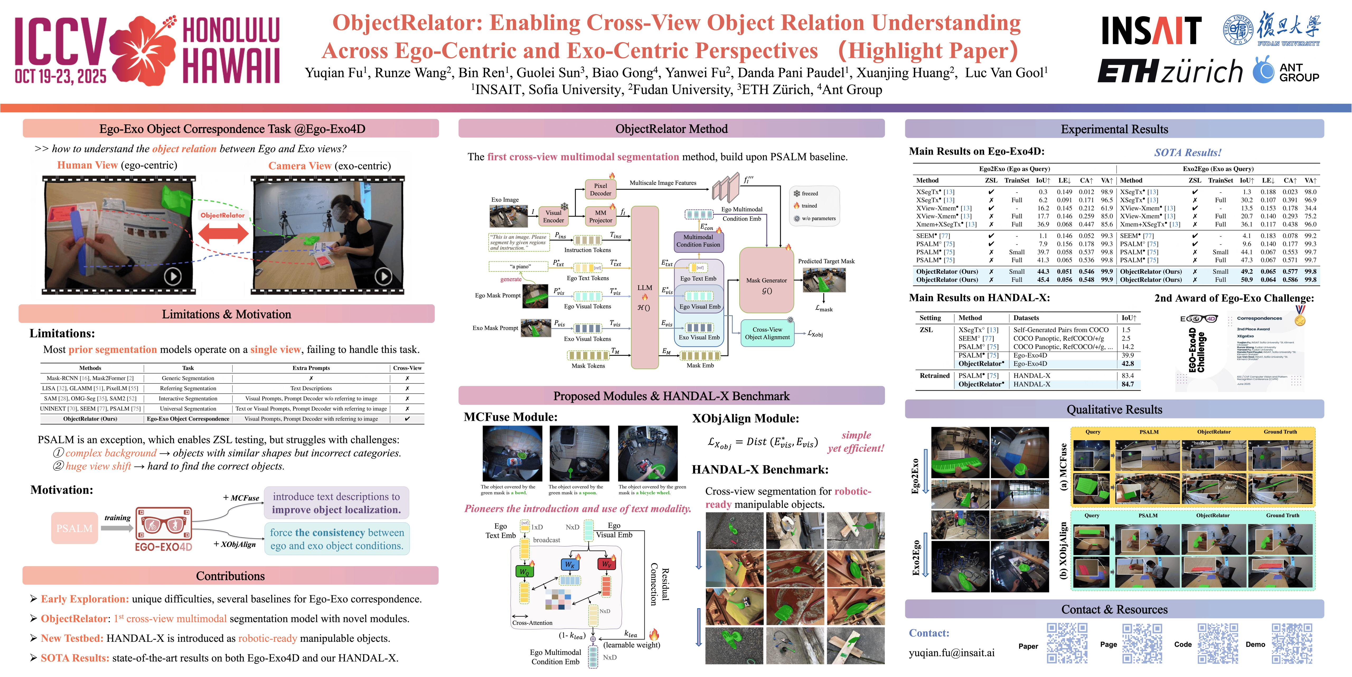 Bridging the gap between ego-centric and exo-centric views has been a long-standing question in computer vision. In this paper, we focus on the emerging Ego-Exo object correspondence task, which aims to understand object relations across ego-exo perspectives through segmentation. While numerous segmentation models have been proposed, most operate on a single image (view), making them impractical for cross-view scenarios. PSALM, a recently proposed segmentation method, stands out as a notable exception with its demonstrated zero-shot ability on this task. However, due to the drastic viewpoint change between ego and exo, PSALM fails to accurately locate and segment objects, especially in complex backgrounds or when object appearances change significantly. To address these issues, we propose ObjectRelator, a novel approach featuring two key modules: Multimodal Condition Fusion (MCFuse) and SSL-based Cross-View Object Alignment (XObjAlign). MCFuse introduces language as an additional cue, integrating both visual masks and textual descriptions to improve object localization and prevent incorrect associations. XObjAlign enforces cross-view consistency through self-supervised alignment, enhancing robustness to object appearance variations. Extensive experiments demonstrate ObjectRelator’s effectiveness on the large-scale Ego-Exo4D benchmark and HANDAL-X (an adapted dataset for cross-view segmentation) with state-of-the-art performance. Codes and models will be released.