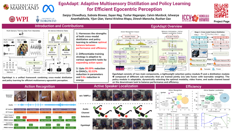 Modern perception models, particularly those designedfor multisensory egocentric tasks, have achieved remark-able performance but often come with substantial compu-tational costs. These high demands pose challenges forreal-world deployment, especially in resource-constrainedenvironments. In this paper, we introduce EGOADAPT, aframework that adaptively performs cross-modal distilla-tion and policy learning to enable efficient inference acrossdifferent egocentric perception tasks, including egocentricaction recognition, active speaker localization, and behav-ior anticipation. Our proposed policy module is adapt-able to task-specific action spaces, making it broadly appli-cable. Experimental results on three challenging egocen-tric datasets—EPIC-Kitchens, EasyCom, and Aria Every-day Activities—demonstrate that our method significantlyenhances efficiency, reducing GMACs by up to 89.09%, pa-rameters up to 82.02%, and energy up to 9.6×, while stillon-par and in many cases outperforming, the performanceof corresponding state-of-the-art models.