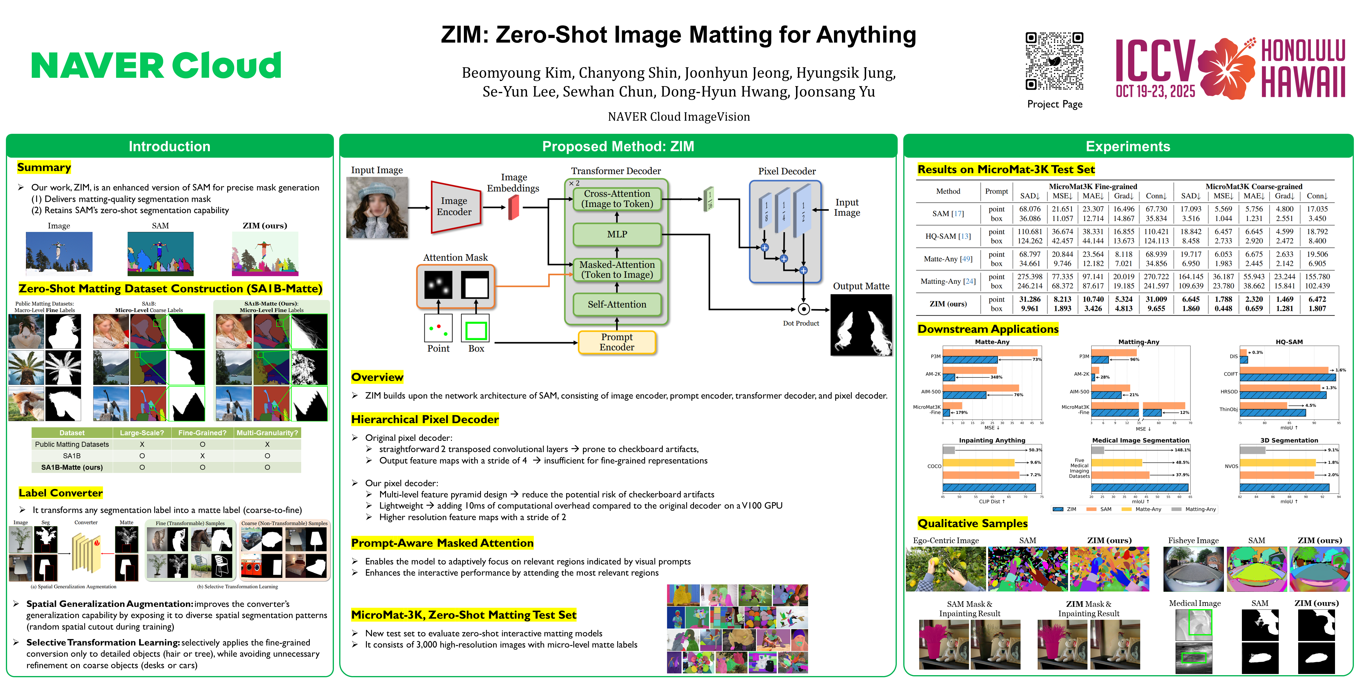 The recent segmentation foundation model, Segment Anything Model (SAM), exhibits strong zero-shot segmentation capabilities, but it falls short in generating fine-grained precise masks. To address this limitation, we propose a novel zero-shot image matting model, called ZIM, with two key contributions: First, we develop a label converter that transforms segmentation labels into detailed matte labels, constructing the new SA1B-Matte dataset without costly manual annotations. Training SAM with this dataset enables it to generate precise matte masks while maintaining its zero-shot capability. Second, we design the zero-shot matting model equipped with a hierarchical pixel decoder to enhance mask representation, along with a prompt-aware masked attention mechanism to improve performance by enabling the model to focus on regions specified by visual prompts. We evaluate ZIM using the newly introduced MicroMat-3K test set, which contains high-quality micro-level matte labels. Experimental results show that ZIM outperforms existing methods in fine-grained mask generation and zero-shot generalization. Furthermore, we demonstrate the versatility of ZIM in various downstream tasks requiring precise masks, such as image inpainting and 3D segmentation. Our contributions provide a robust foundation for advancing zero-shot matting and its downstream applications across a wide range of computer vision tasks. The code will be available soon.