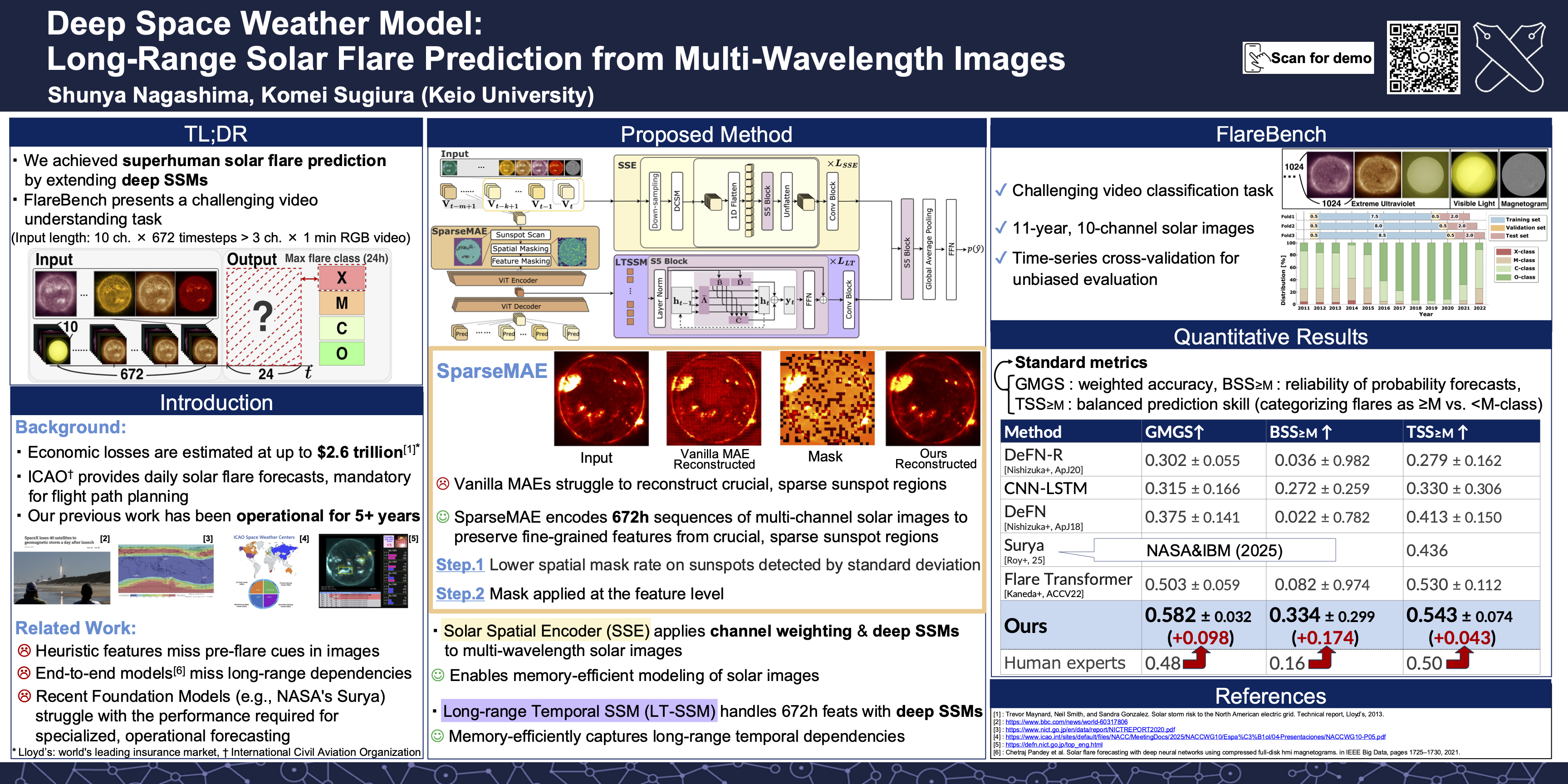 Accurate, reliable solar flare prediction is crucial for mitigating potential disruptions to critical infrastructure, while predicting solar flares remains a significant challenge. Existing methods based on heuristic physical features often lack representation learning from solar images. On the other hand, end-to-end learning approaches struggle to model long-range temporal dependencies in solar images.In this study, we propose Deep Space Weather Model (Deep SWM), which is based on multiple deep state space models for handling both ten-channel solar images and long-range spatio-temporal dependencies. Deep SWM also features a sparse masked autoencoder, a novel pretraining strategy that employs a two-phase masking approach to preserve crucial regions such as sunspots while compressing spatial information.Furthermore, we built FlareBench, a new public benchmark for solar flare prediction covering a full 11-year solar activity cycle, to validate our method.Our method outperformed baseline methods and even human expert performance on standard metrics in terms of performance and reliability. The project page can be found at https://iccv25-6qrol.kinsta.page.