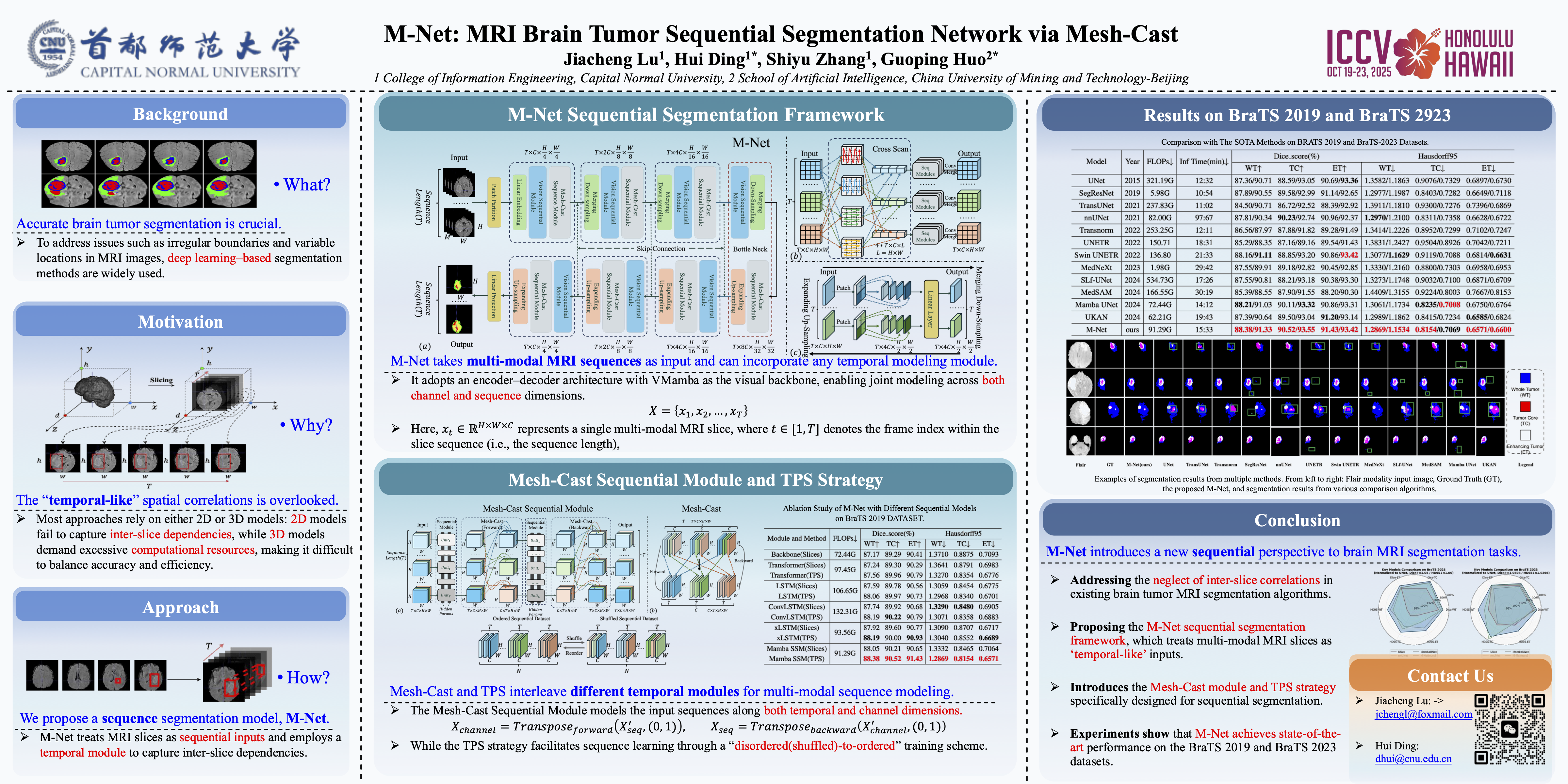 MRI tumor segmentation remains a critical challenge in medical imaging, where volumetric analysis faces unique computational demands due to the complexity of 3D data. The spatially sequential arrangement of adjacent MRI slices provides valuable information that enhances segmentation continuity and accuracy, yet this characteristic remains underutilized in many existing models. The spatial correlations between adjacent MRI slices can be regarded as “temporal-like” data, similar to frame sequences in video segmentation tasks. To bridge this gap, we propose M-Net, a flexible framework specifically designed for sequential image segmentation. M-Net introduces the novel Mesh-Cast mechanism, which seamlessly integrates arbitrary sequential models into the processing of both channel and temporal information, thereby systematically capturing the inherent “temporal-like” spatial correlations between MRI slices and ensuring consistent segmentation across sequences. Additionally, we define an MRI sequential input pattern and design a Two-Phase Sequential (TPS) training strategy, which first focuses on learning common patterns across sequences before refining slice-specific feature extraction. This approach leverages temporal modeling techniques to preserve volumetric contextual information while avoiding the high computational cost of full 3D convolutions, thereby enhancing the generalizability and robustness of M-Net in sequential segmentation tasks. Experiments on the BraTS2019 and BraTS2023 datasets demonstrate that M-Net outperforms existing methods across all key metrics, establishing itself as a robust solution for temporally-aware MRI tumor segmentation.