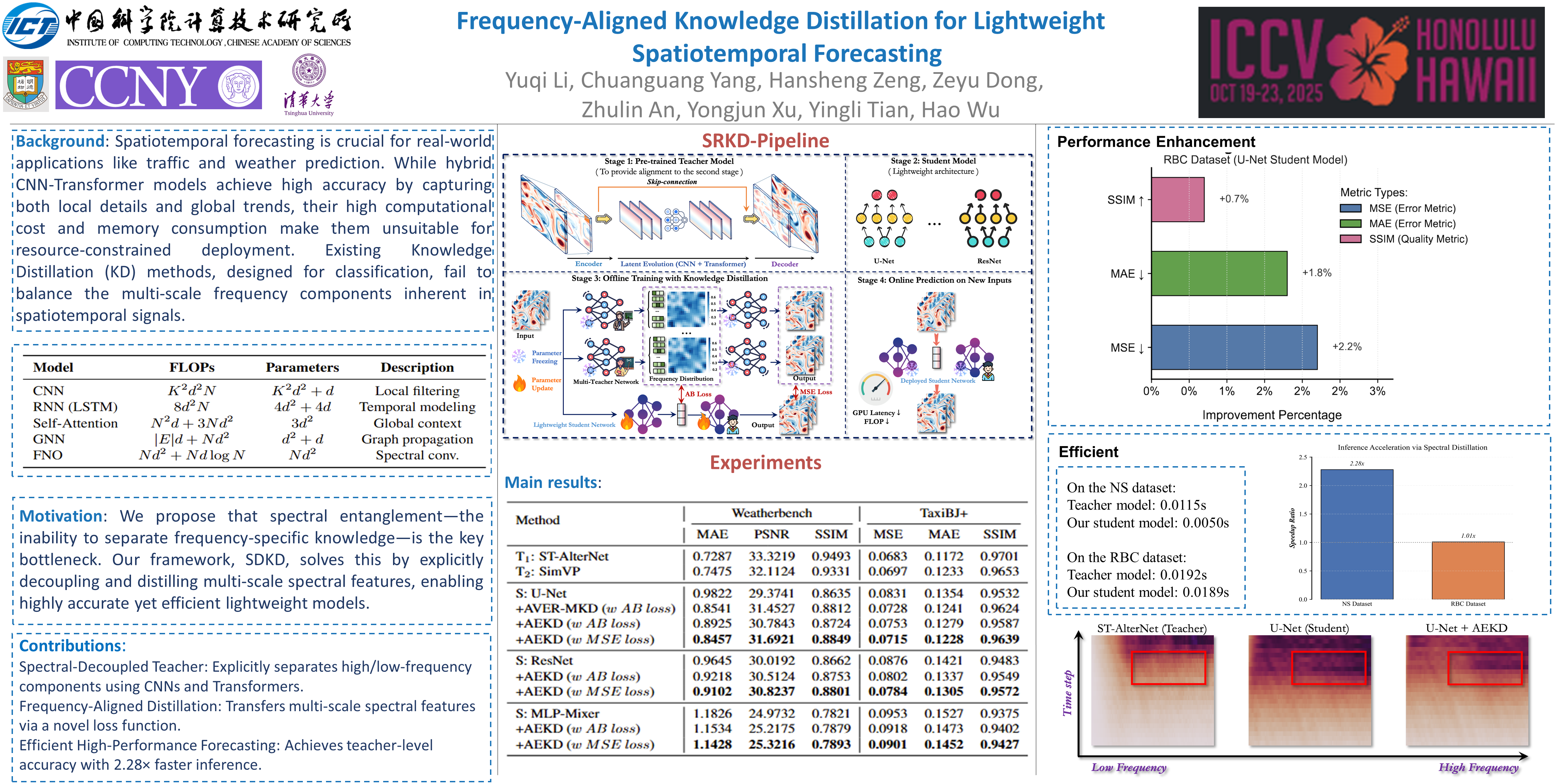 Spatiotemporal forecasting tasks, such as traffic flow, combustion dynamics, and weather forecasting, often require complex models that suffer from low training efficiency and high memory consumption. This paper proposes a lightweight framework, Spectral Decoupled Knowledge Distillation, which transfers the multi-scale spatiotemporal representations from a complex teacher model to a more efficient lightweight student network. The teacher model follows an encoder-latent evolution-decoder architecture, where its latent evolution module decouples high-frequency details (e.g., instant traffic fluctuations) and low-frequency trends (e.g. long-term weather evolution) using convolution (local high-frequency extractor) and Transformer (global low-frequency modeler). However, the multi-layer convolution and deconvolution structures result in slow training and high memory usage. To address these issues, we propose a frequency-aligned knowledge distillation strategy, which extracts multi-scale spectral features from the teacher’s latent space, including high and low frequency components, to guide the lightweight student model (e.g., ResNet, U-Net) in capturing both local fine-grained variations and global evolution patterns. Experiments show that the student model achieves over 95% of the teacher’s forecasting accuracy while using only 20%-30% of its memory, with training speed improved by more than 50%. Our theoretical analysis reveals that the frequency-domain decoupling enables the student model to capture long-range dependencies without the need for complex structures. The frequency-aligned distillation mechanism further mitigates the inherent bias of lightweight models in cross-scale spatiotemporal dynamics modeling. This framework offers an effective and general solution for high-accuracy spatiotemporal forecasting in resource-constrained scenarios.