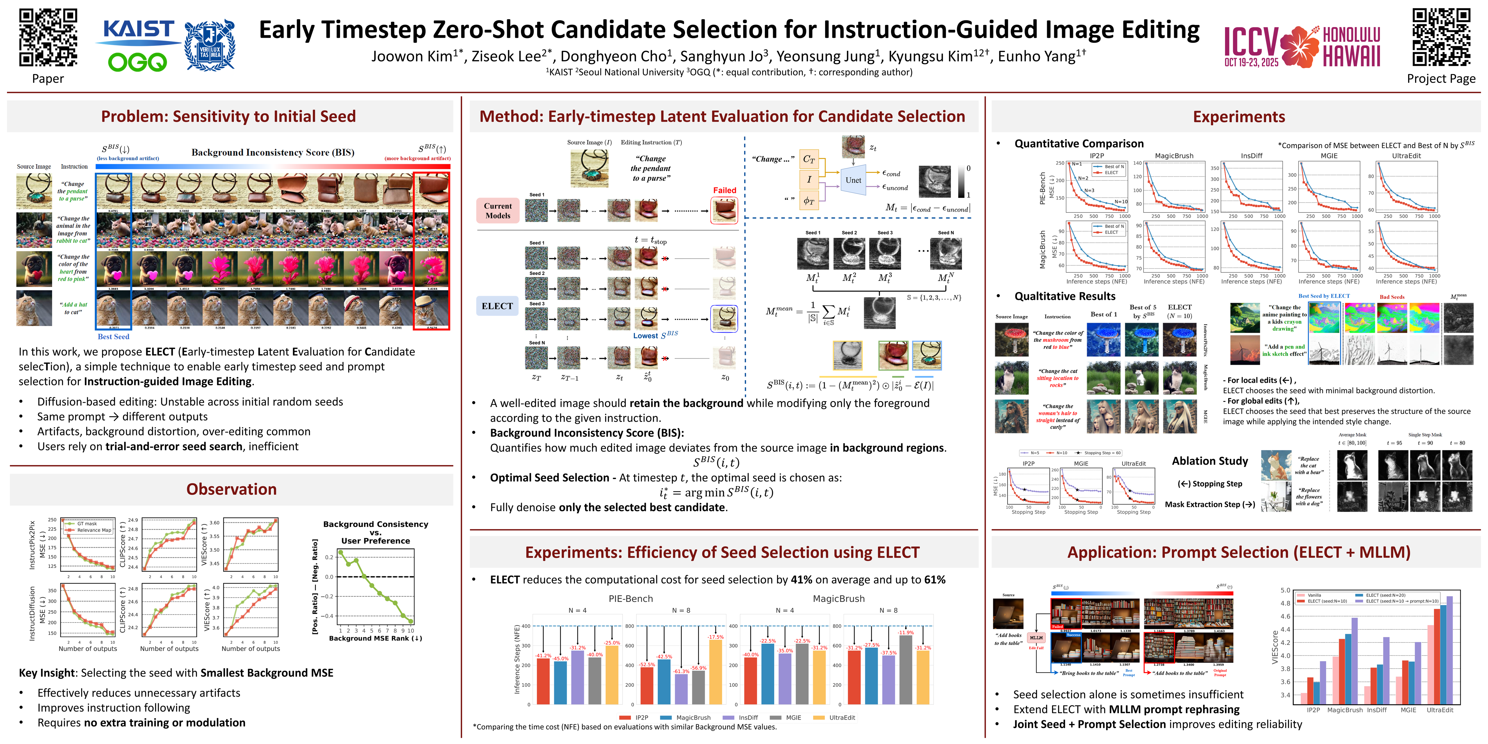 Despite recent advances in diffusion models, achieving reliable image generation and editing results remains challenging due to the inherent diversity induced by stochastic noise in the sampling process. Particularly, instruction-guided image editing with diffusion models offers user-friendly editing capabilities, yet editing failures, such as background distortion, frequently occur across different attempts. Users often resort to trial and error, adjusting seeds or prompts to achieve satisfactory results, which is inefficient.While seed selection methods exist for Text-to-Image (T2I) generation, they depend on external verifiers, limiting their applicability, and evaluating multiple seeds increases computational complexity, reducing practicality.To address this, we first establish a new multiple-seed-based image editing baseline using background consistency scores, achieving Best-of-N performance without supervision. Building on this, we introduce ELECT (Early-timestep Latent Evaluation for Candidate Selection), a zero-shot framework that selects reliable seeds by estimating background mismatches at early diffusion timesteps, identfying the seed that retains the background while modifying only the foreground. ELECT ranks seed candidates by a background inconsistency score, filtering unsuitable samples early based on background consistency while fully preserving editability.Beyond standalone seed selection, ELECT integrates into instruction-guided editing pipelines and extends to Multimodal Large-Language Models (MLLMs) for joint seed + prompt selection, further improving results when seed selection alone is insufficient. Experiments show that ELECT reduces computational costs (by 41\% on average and up to 61\%) while improving background consistency and instruction adherence, achieving around 40\% success rates in previously failed cases—without any external supervision or training.