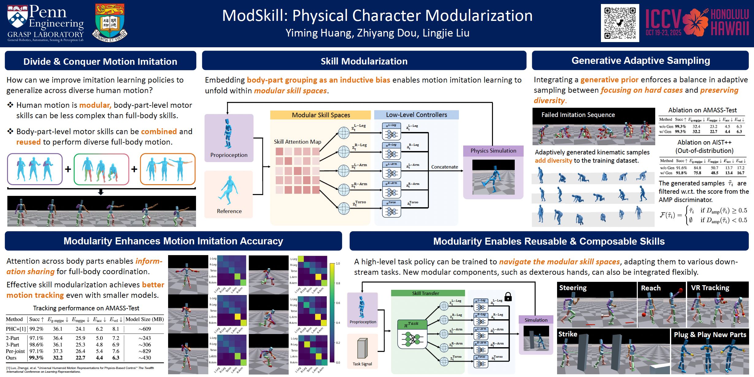 Human motion is highly diverse and dynamic, posing challenges for imitation learning algorithms that aim to generalize motor skills for controlling simulated characters. Prior methods typically rely on a universal full-body controller for tracking reference motion (tracking-based model) or a unified full-body skill embedding space (skill embedding). However, these approaches often struggle to generalize and scale to larger motion datasets. In this work, we introduce a novel skill learning framework, ModSkill, that decouples complex full-body skills into compositional, modular skills for independent body parts, leveraging body structure-inspired inductive bias to enhance skill learning performance. Our framework features a skill modularization attention mechanism that processes policy observations into modular skill embeddings that guide low-level controllers for each body part. We further propose an Active Skill Learning approach with Generative Adaptive Sampling, using large motion generation models to adaptively enhance policy learning in challenging tracking scenarios. Results show that this modularized skill learning framework, enhanced by generative sampling, outperforms existing methods in precise full-body motion tracking and enables reusable skill embeddings for diverse goal-driven tasks. Our code will be released publicly upon publication.