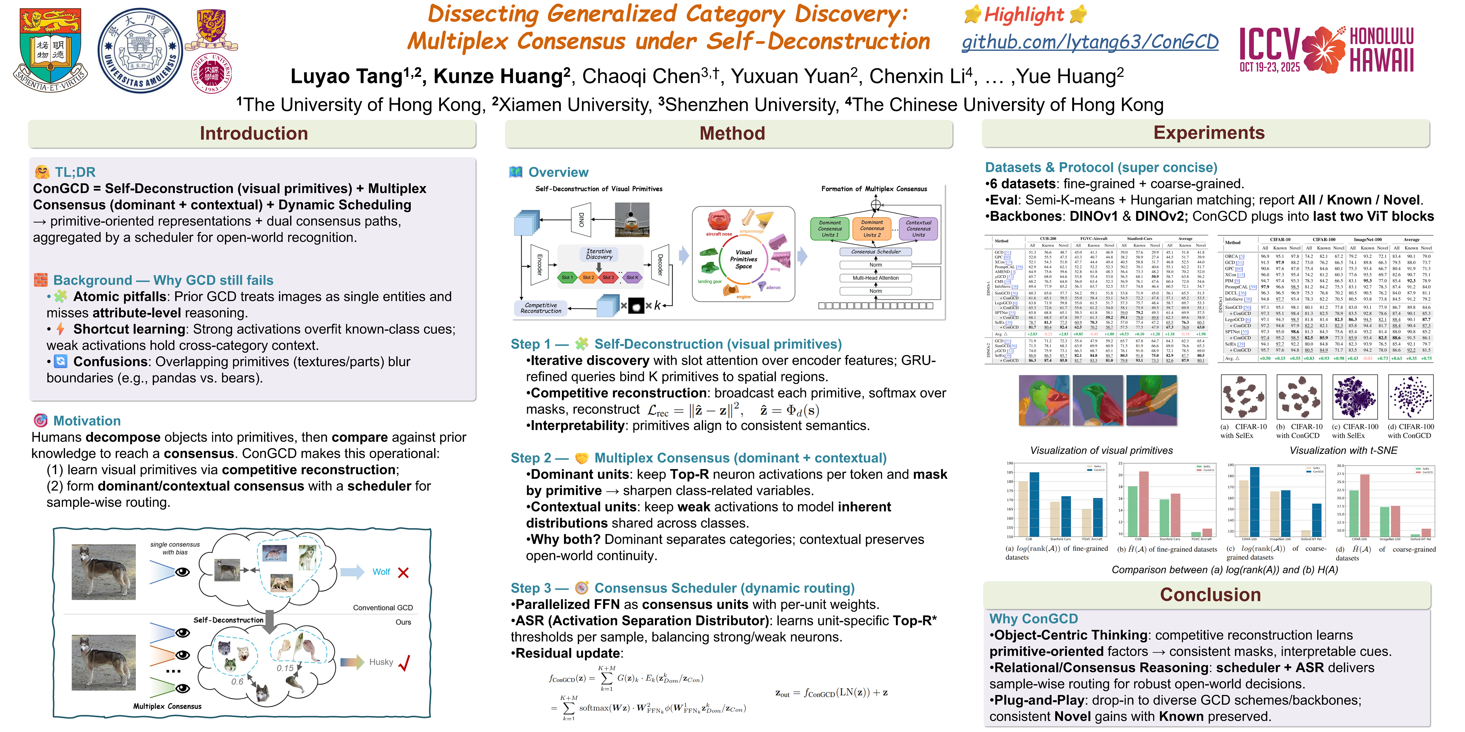 Human perceptual systems excel at inducing and recognizing objects across both known and novel categories, a capability far beyond current machine learning frameworks. While generalized category discovery (GCD) aims to bridge this gap, existing methods predominantly focus on optimizing objective functions. We present an orthogonal solution, inspired by the human cognitive process for novel object understanding: decomposing objects into visual primitives and establishing cross-knowledge comparisons. We propose ConGCD, which establishes primitive-oriented representations through high-level semantic reconstruction, binding intra-class shared attributes via deconstruction. Mirroring human preference diversity in visual processing, where distinct individuals leverage dominant or contextual cues, we implement dominant and contextual consensus units to capture class-discriminative patterns and inherent distributional invariants, respectively. A consensus scheduler dynamically optimizes activation pathways, with final predictions emerging through multiplex consensus integration. Extensive evaluations across coarse- and fine-grained benchmarks demonstrate ConGCD's effectiveness as a consensus-aware paradigm.