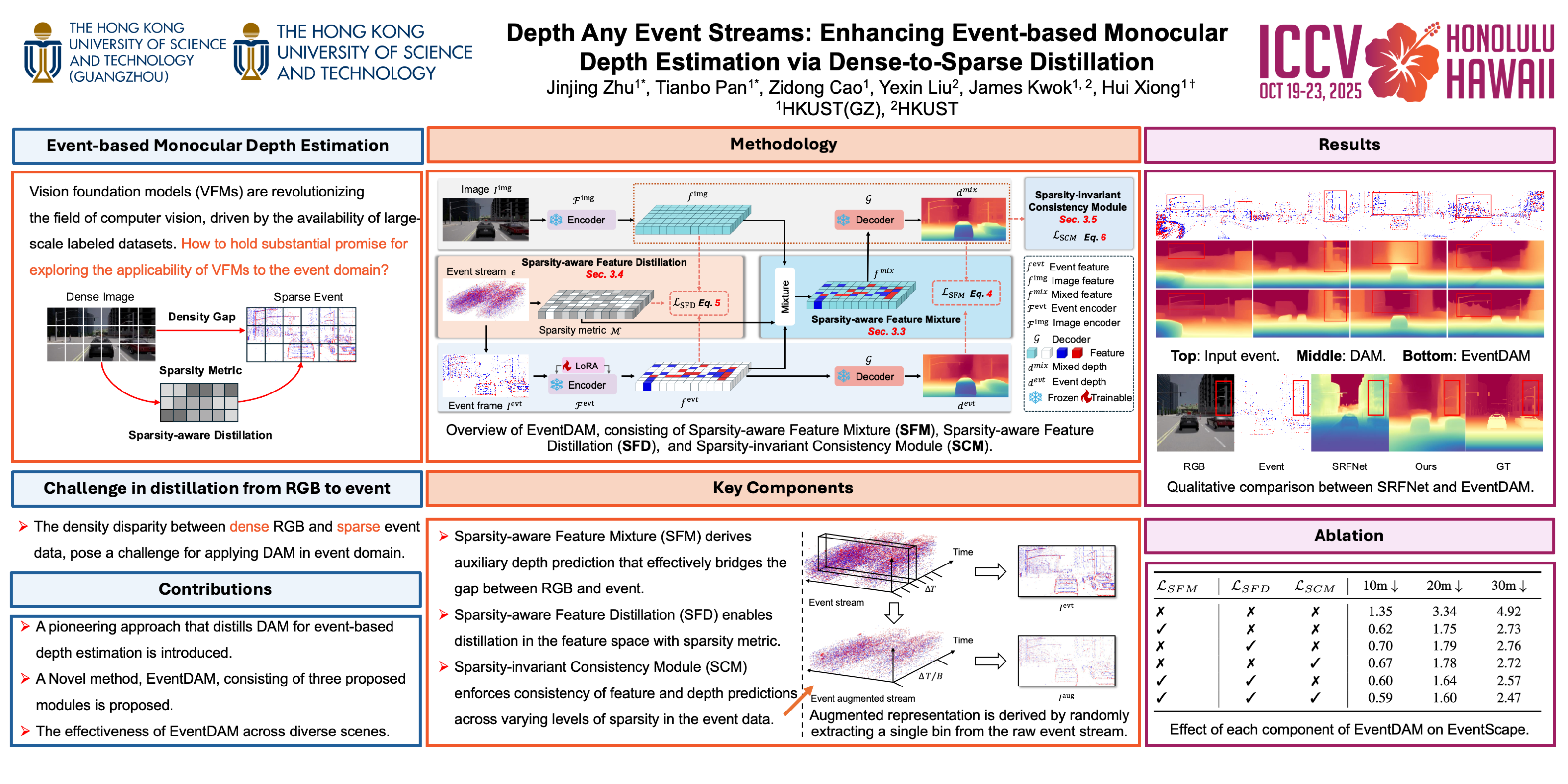 With the superior sensitivity of event cameras to high-speed motion and extreme lighting conditions, event-based monocular depth estimation has gained popularity to predict structural information about surrounding scenes in challenging environments. However, the scarcity of labeled event data constrains prior supervised learning methods. Unleashing the promising potential of the existing RGB-based depth foundation model, DAM~\cite{yang2024depth}, we propose Depth Any Event stream (EventDAM) to achieve high-performance event-based monocular depth estimation in an annotation-free manner. EventDAM effectively combines paired dense RGB images with sparse event data by incorporating three key cross-modality components: Sparsity-aware Feature Mixture (SFM), Sparsity-aware Feature Distillation (SFD), and Sparsity-invariant Consistency Module (SCM). With the proposed sparsity metric, SFM mixes features from RGB images and event data to generate auxiliary depth predictions, while SFD facilitates adaptive feature distillation. Furthermore, SCM ensures output consistency across varying sparsity levels in event data, thereby endowing EventDAM with zero-shot capabilities across diverse scenes. Extensive experiments across a variety of benchmark datasets, compared to approaches using diverse input modalities, robustly substantiate the generalization and zero-shot capabilities of EventDAM. Project page: \url{http://}.