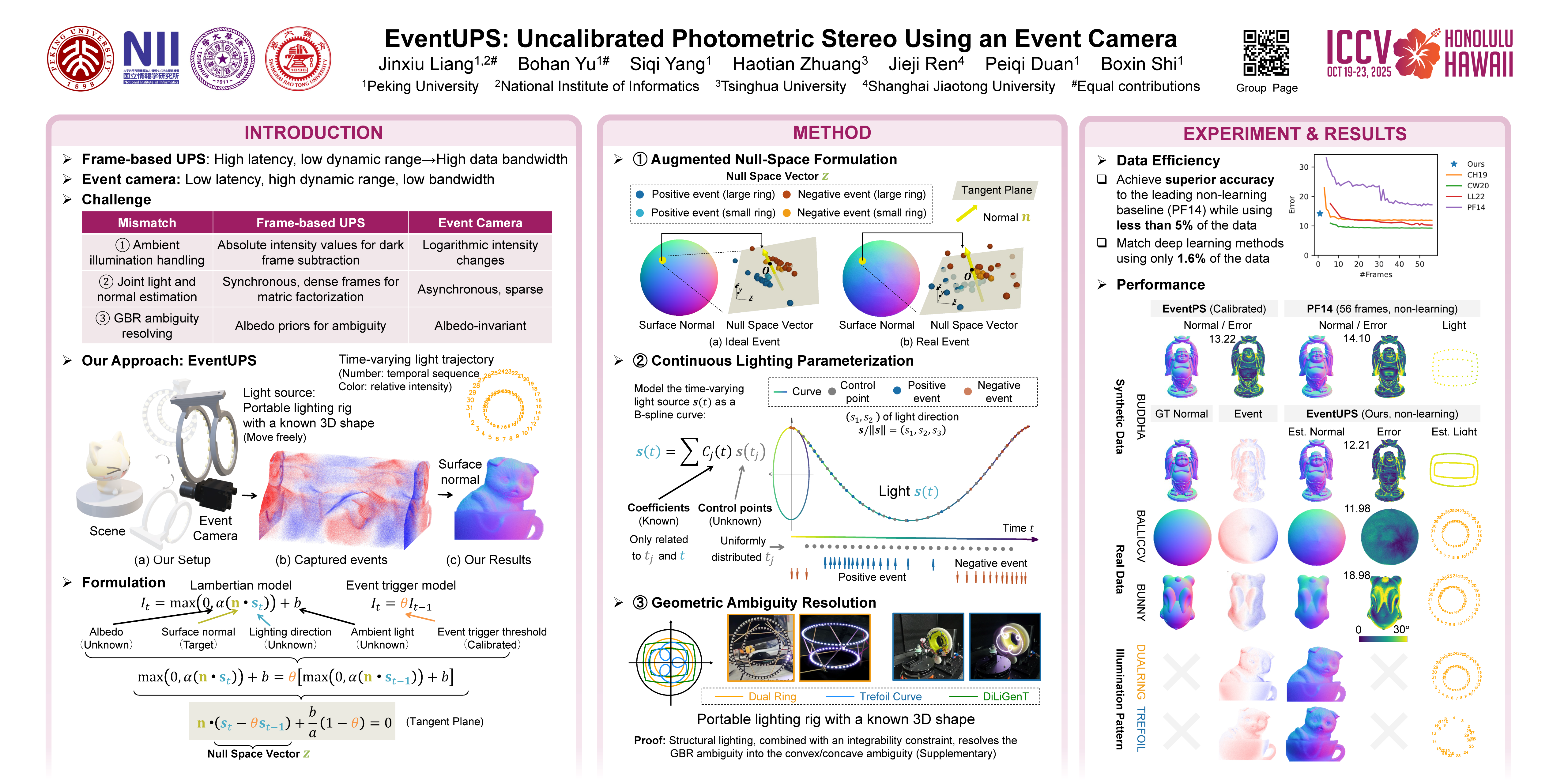 We present EventUPS, the first uncalibrated photometric stereo method using event cameras—neuromorphic sensors that asynchronously detect brightness changes with microsecond resolution. Frame-based uncalibrated photometric stereo methods imposed high bandwidth demands and limiting applicability in dynamic scenes. They require dense image correspondence under varying illumination, cannot be directly applicable due to event data due to their fundamentally different sensing paradigm. Our approach introduces three key innovations: i) an augmented null space formulation that directly relates each event to constraints on surface normals and lighting, naturally handling ambient illumination; ii) a continuous parameterization of time-varying illumination that bridges asynchronous events to synchronized lighting estimation; iii) a structured lighting approach with known relative geometry that resolves the ambiguity to merely convex-concave uncertainty. We validate EventUPS using a custom-built LED-based lighting system implementing dual-ring and trefoil curve patterns. Extensive experiments on synthetic, semi-real, and real data demonstrate that our method achieves accuracy surpassing frame-based counterpart while requiring only 5\% of the data bandwidth.