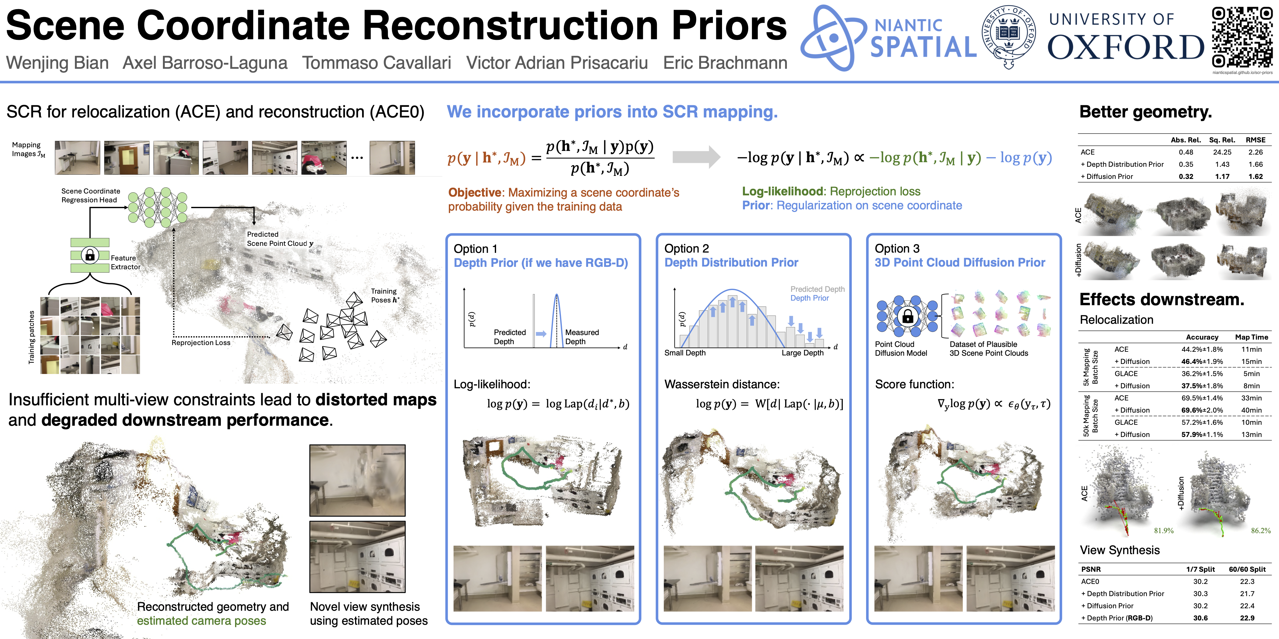 Scene coordinate regression (SCR) models have proven to be powerful implicit scene representations for 3D vision, enabling visual relocalization and structure-from-motion. SCR models are trained specifically for one scene. If training images imply insufficient multi-view constraints to recover the scene geometry, SCR models degenerate. We present a probabilistic reinterpretation of training SCR models, which allows us to infuse high-level reconstruction priors. We investigate multiple such priors, ranging from simple priors over the distribution of reconstructed depth values to learned priors over plausible scene coordinate configurations. For the latter, we train a 3D point cloud diffusion model on a large corpus of indoor scans. Our priors push predicted 3D scene points towards a more plausible geometry at each training step to increase their likelihood. On three indoor datasets our priors help learning better scene representations, resulting in more coherent scene point clouds, higher registration rates and better camera poses, with a positive effect on down-stream tasks such as novel view synthesis and camera relocalization.
