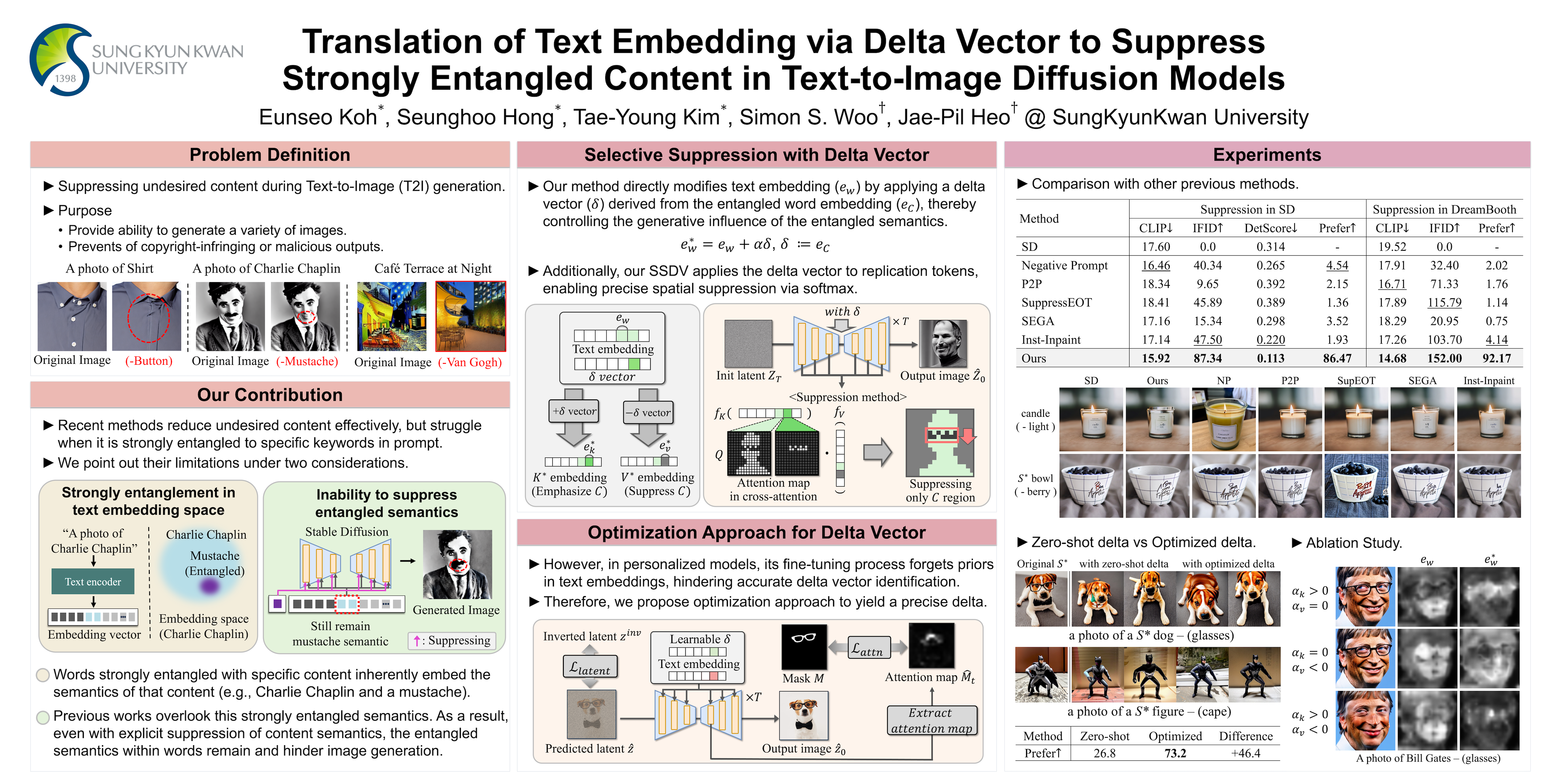 Text-to-Image (T2I) diffusion models have made significant progress in generating diverse high-quality images from textual prompts. However, these models still face challenges in suppressing content that is strongly entangled with specific words. For example, when generating an image of "Charlie Chaplin", a "mustache" consistently appears even if explicitly instructed not to include it, as the concept of "mustache" is strongly entangled with "Charlie Chaplin". To address this issue, we propose a novel approach to directly suppress such entangled content within the text embedding space of diffusion models. Our method introduces a delta vector that modifies the text embedding to weaken the influence of undesired content in the generated image, and we further demonstrate that this delta vector can be easily obtained through a zero-shot approach. Furthermore, we propose a Selective Suppression with Delta Vector (SSDV) method to adapt the delta vector into the cross-attention mechanism, enabling more effective suppression of unwanted content in regions where it would otherwise be generated. Additionally, we enabled more precise suppression in personalized T2I models by optimizing the delta vector, which previous baselines were unable to achieve. Extensive experimental results demonstrate that our approach significantly outperforms existing methods, both in terms of quantitative and qualitative metrics.