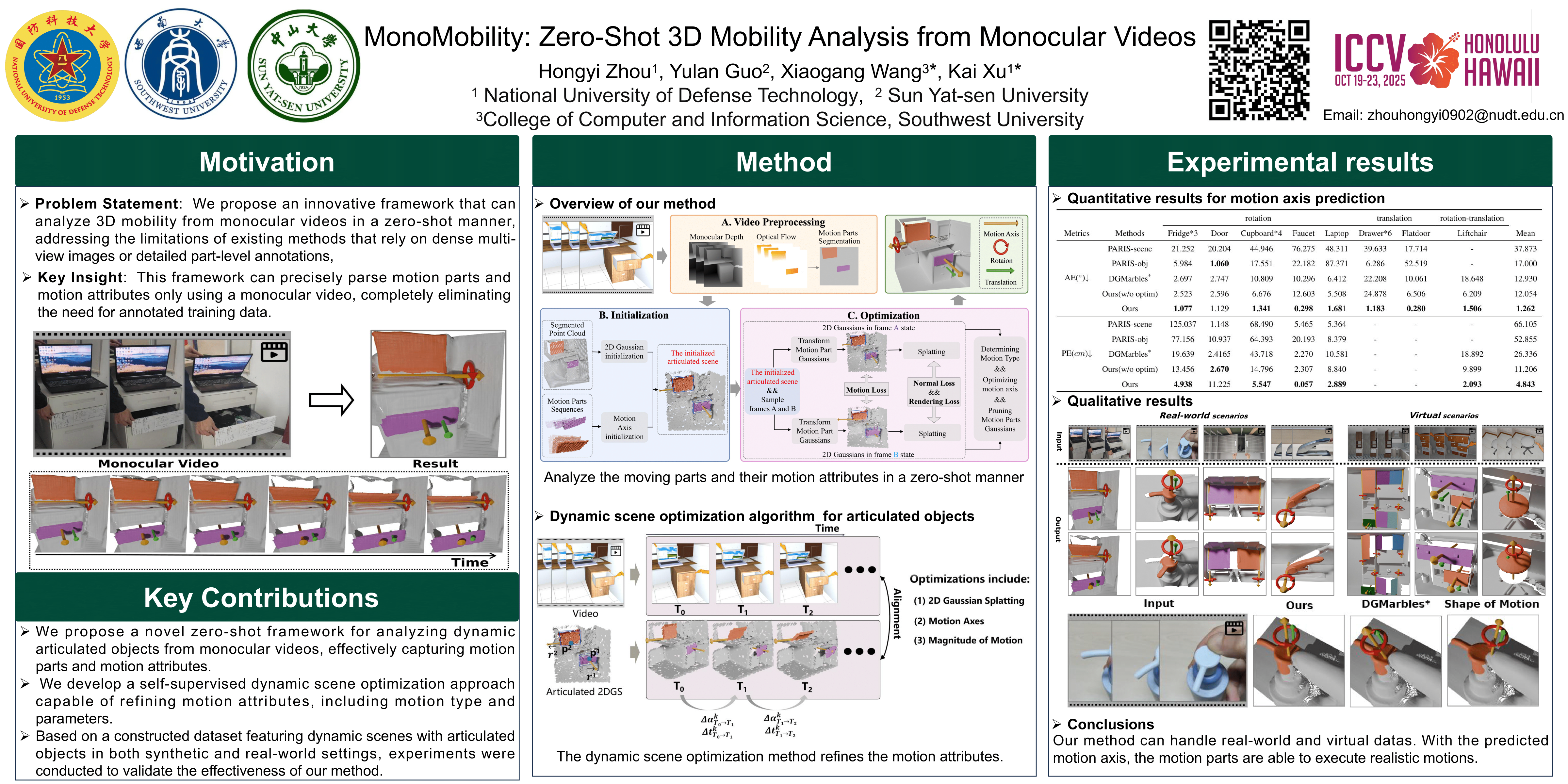 Accurately analyzing the motion parts and their motion attributes in dynamic environments is crucial for advancing key areas such as embodied intelligence. Addressing the limitations of existing methods that rely on dense multi-view images or detailed part-level annotations, we propose an innovative framework that can analyze 3D mobility from monocular videos in a zero-shot manner. This framework can precisely parse motion parts and motion attributes only using a monocular video, completely eliminating the need for annotated training data. Specifically, our method first constructs the scene geometry and roughly analyzes the motion parts and their initial motion attributes combining depth estimation, optical flow analysis and point cloud registration method, then employs 2D Gaussian splatting for scene representation. Building on this, we introduce an end-to-end dynamic scene optimization algorithm specifically designed for articulated objects, refining the initial analysis results to ensure the system can handle ‘rotation’, ‘translation’, and even complex movements (‘rotation+translation’), demonstrating high flexibility and versatility. To validate the robustness and wide applicability of our method, we created a comprehensive dataset comprising both simulated and real-world scenarios. Experimental results show that our framework can effectively analyze articulated object motions in an annotation-free manner, showcasing its significant potential in future embodied intelligence applications.