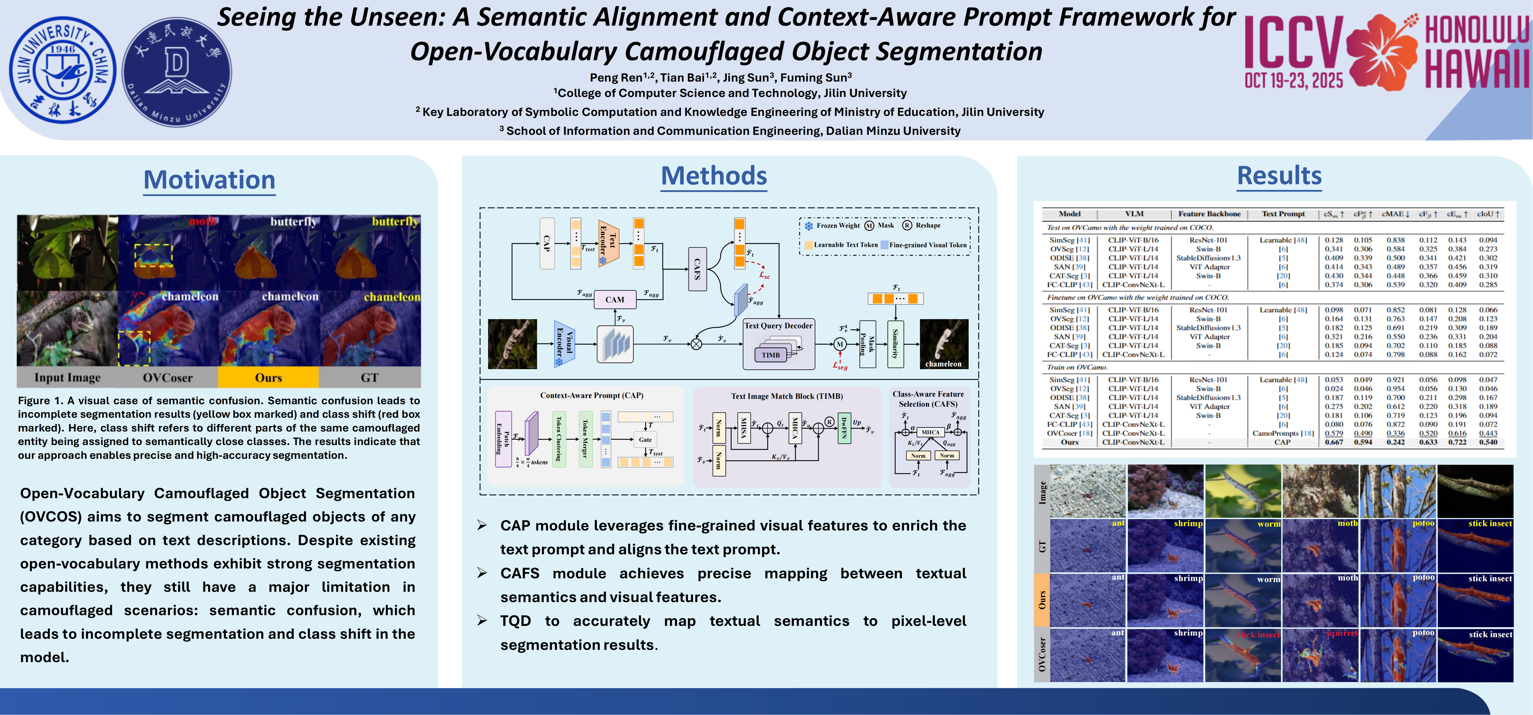 Open-Vocabulary Camouflaged Object Segmentation (OVCOS) aims to segment camouflaged objects of any category based on text descriptions. Despite existing open-vocabulary methods exhibit strong segmentation capabilities, they still have a major limitation in camouflaged scenarios: semantic confusion, which leads to incomplete segmentation and class shift in the model. To mitigate the above limitation, we propose a framework for OVCOS, named SuCLIP. Specifically, we design a context-aware prompt scheme that leverages the internal knowledge of the CLIP visual encoder to enrich the text prompt and align it with local visual features, thereby enhancing the text prompt. To better align the visual semantic space and the text semantic space, we design a class-aware feature selection module to dynamically adjust text and visual embeddings, making them more matched with camouflaged object. Meanwhile, we introduce a semantic consistency loss to mitigate the semantic deviation between the text prompt and visual features, ensuring semantic consistency between the segmentation results and the text prompt. Finally, we design a text query decoder that precisely maps textual semantics to pixel-level segmentation results, thereby achieving semantic-spatial consistent decoding. Experimental results show that SuCLIP significantly outperforms the advanced method OVCoser on the OVCamo dataset.