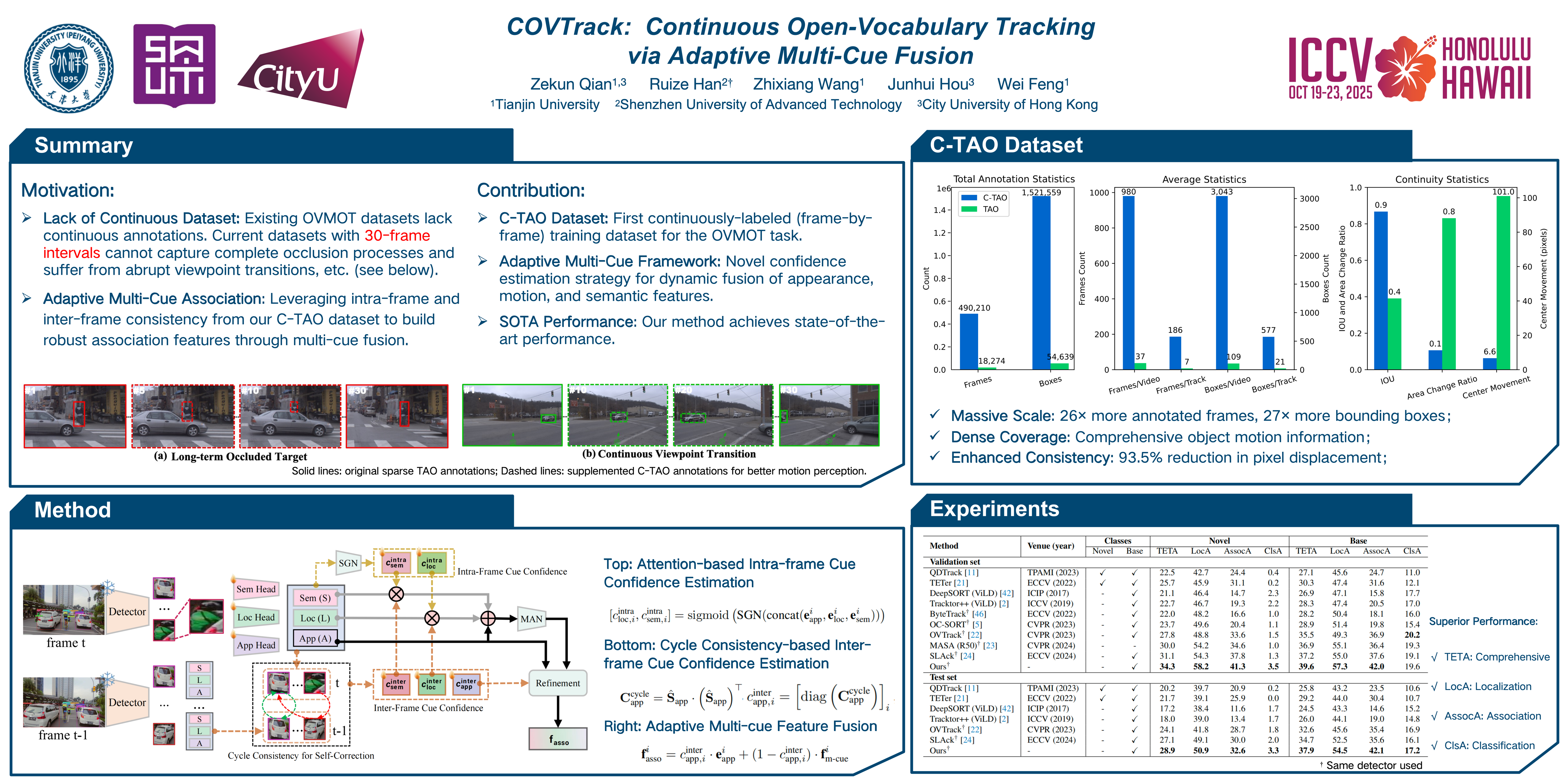 COVTrack: Continuous Open-Vocabulary Tracking via Adaptive Multi-Cue Fusion