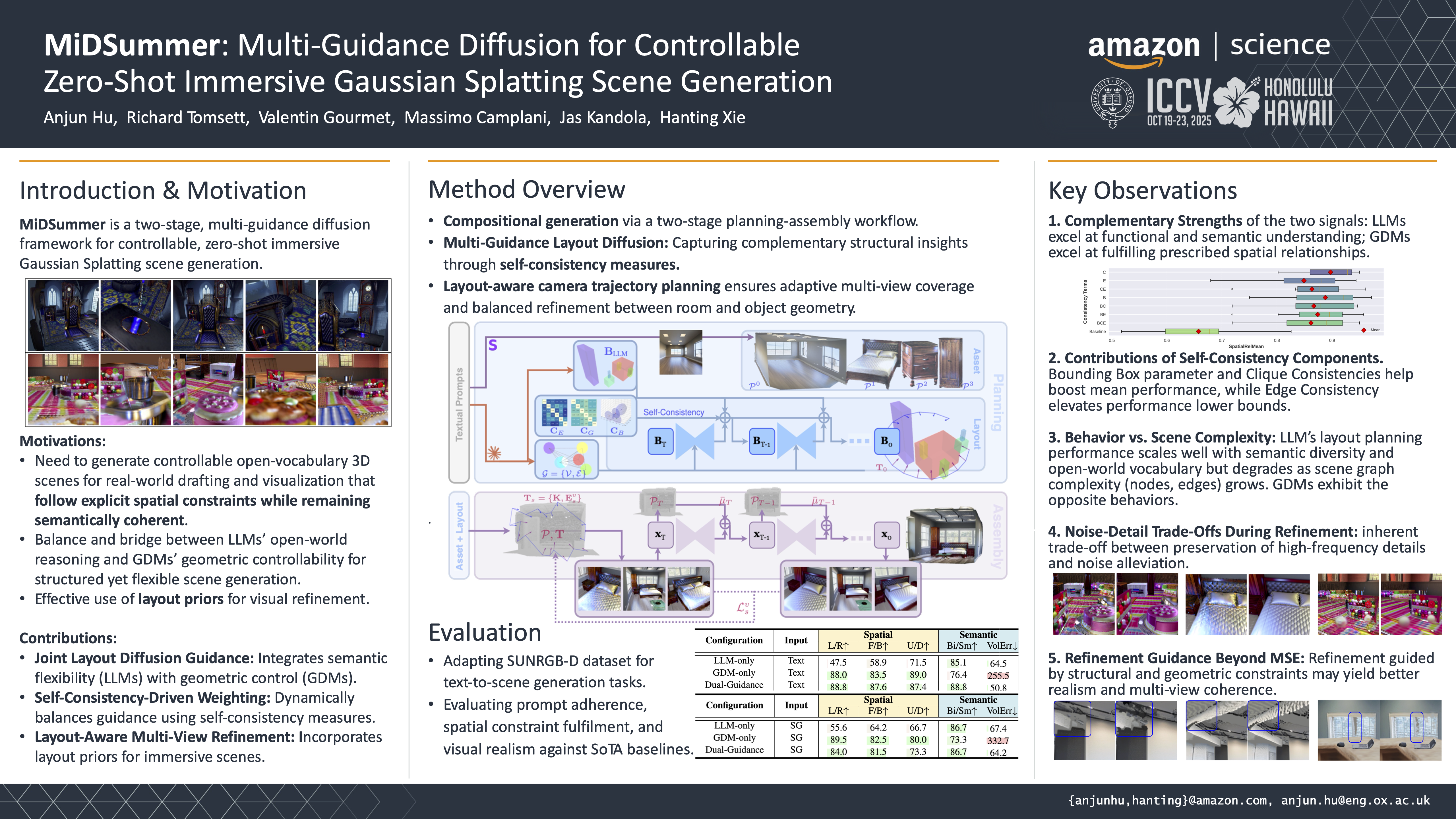 We present MiDSummer, a two-stage framework for generating immersive Gaussian Splatting scenes that leverages multiple diffusion guidance signals to enable structured layout control, enhanced physical realism, and improved visual quality.While 3D scene generation has seen significant recent advances, current approaches could benefit from: (1) achieving precise, reliable layout control while preserving open-world generalization and physical plausibility, (2) balancing high-level semantic reasoning with low-level, directly controllable geometric constraints, and (3) effectively utilizing layout knowledge for visual refinement. Our work addresses these challenges through a structured two-stage planning-assembly framework.For planning, we introduce a dual layout diffusion guidance approach to bridge semantic reasoning and geometric controllability. Our approach uniquely integrates LLMs' open-vocabulary reasoning with Graph Diffusion Models' (GDM) geometric precision by incorporating multi-level self-consistency scores over scene graph structures and layout bounding box parameters. This fusion enables fine-grained control over scene composition while ensuring physical plausibility and faithful prompt interpretation.For assembly, we propose a layout-guided optimization technique for scene refinement. We effectively incorporate layout priors obtained during the planning stage into a Stable Diffusion (SD)-based refinement process that jointly optimizes camera trajectories and scene splats. This layout-aware joint optimization, constrained by multi-view consistency, produces visually compelling immersive scenes that are structurally coherent and controllable.