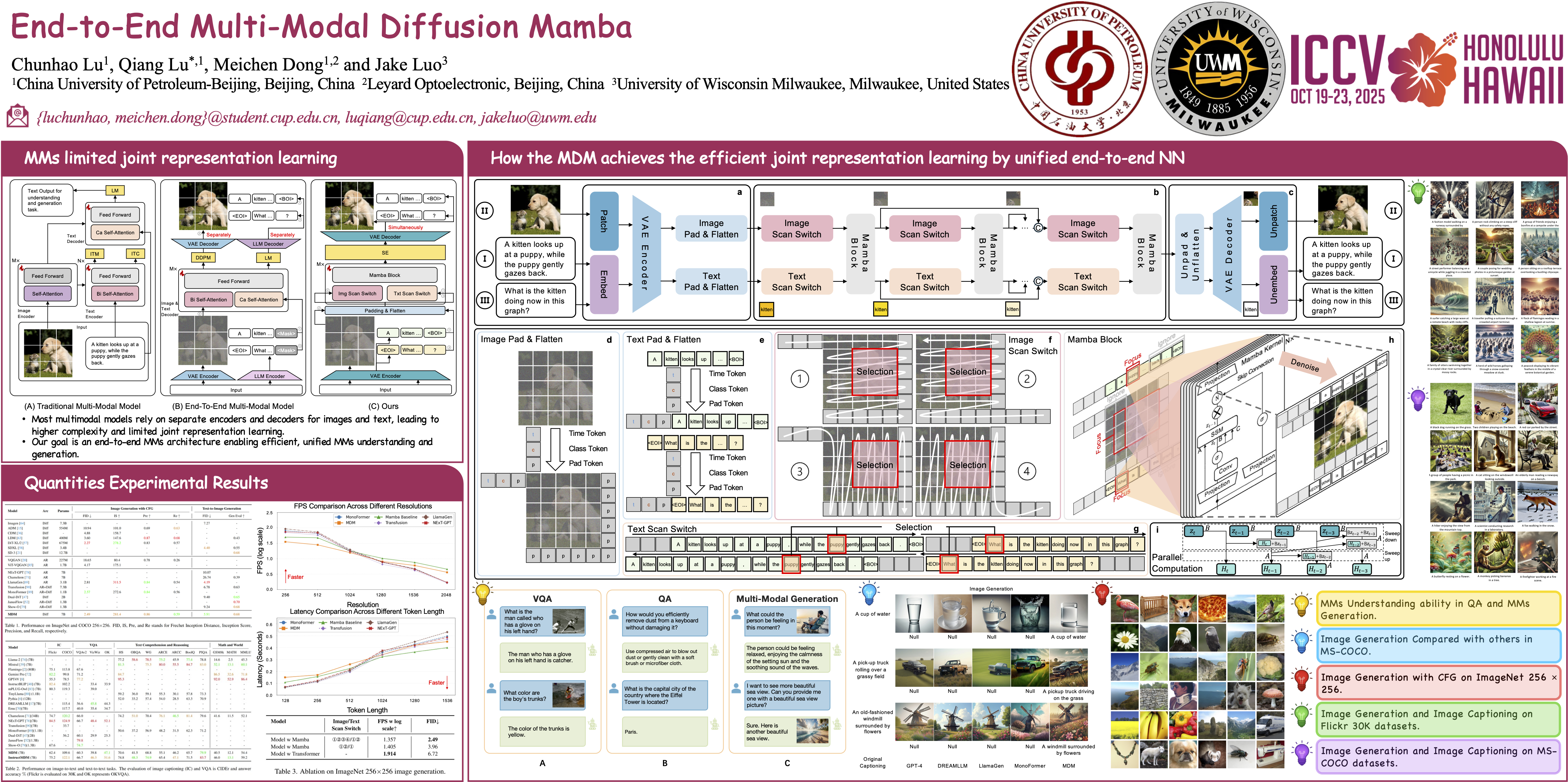 Current end-to-end multi-modal models utilize different encoders and decoders to process input and output information. This separation hinders the joint representation learning of various modalities. To unify multi-modal processing, we propose a novel architecture called MDM (Multi-modal Diffusion Mamba). MDM utilizes a Mamba-based multi-step selection diffusion model to progressively generate and refine modality-specific information through a unified variational autoencoder for both encoding and decoding. This innovative approach allows MDM to achieve superior performance when processing high-dimensional data, particularly in generating high-resolution images and extended text sequences simultaneously. Our evaluations in areas such as image generation, image captioning, visual question answering, text comprehension, and reasoning tasks demonstrate that MDM significantly outperforms existing end-to-end models (MonoFormer, LlamaGen, and Chameleon etc.) and competes effectively with SOTA models like GPT-4V, Gemini Pro, and Mistral. Our results validate MDM's effectiveness in unifying multi-modal processes while maintaining computational efficiency, establishing a new direction for end-to-end multi-modal architectures.