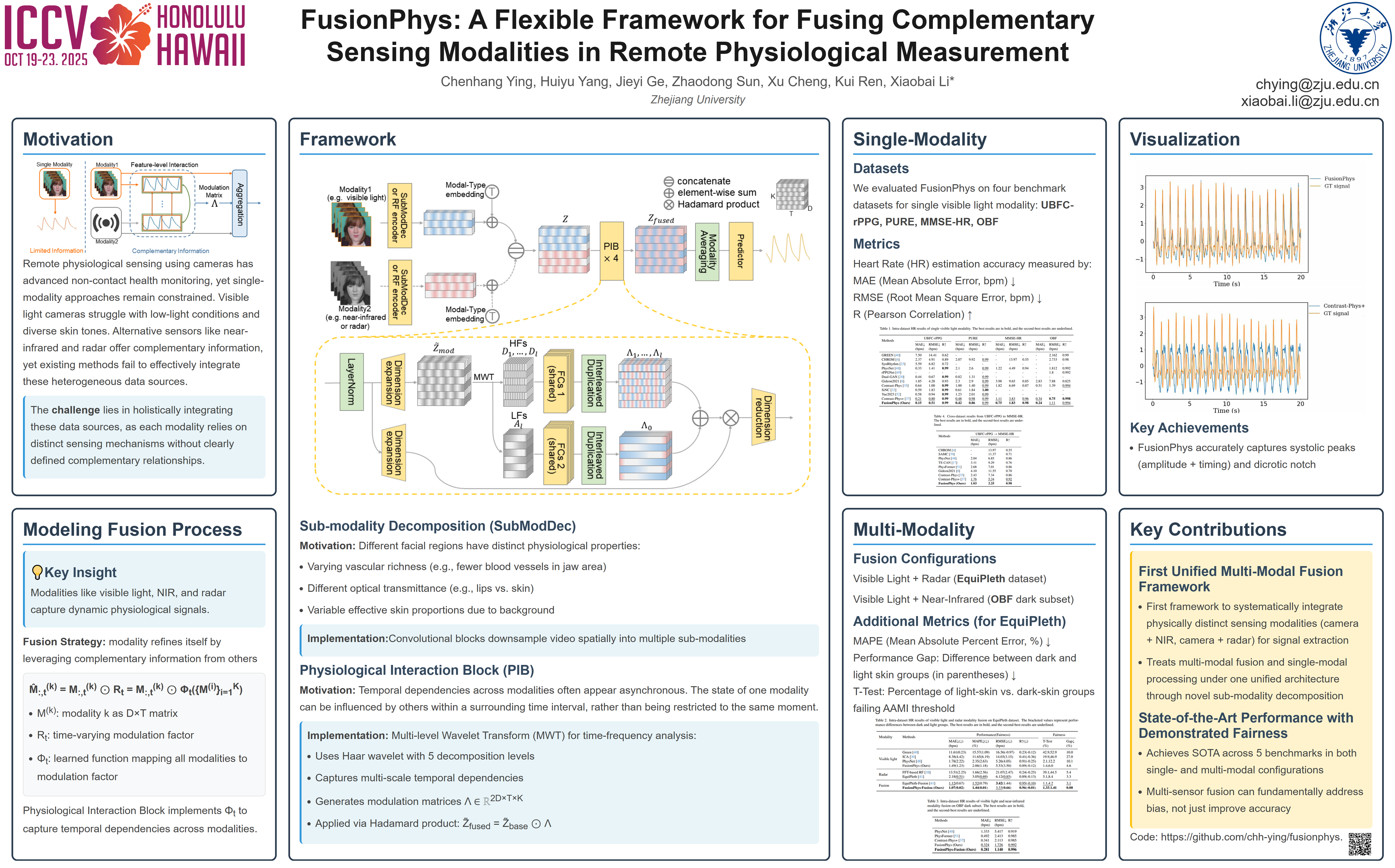 Remote physiological measurement using visible light cameras has emerged as a powerful tool for non-contact health monitoring, yet its reliability degrades under challenging conditions such as low-light environments or diverse skin tones. These limitations have motivated the exploration of alternative sensing modalities, such as near-infrared sensors and radar systems, which offer complementary physiological information due to their distinct sensing principles. While alternative modalities capture complementary physiological cues through distinct sensing principles, existing methods fail to holistically integrate these heterogeneous data. Our key insight is that while visible light, near-infrared, and radar operate on distinct physical principles, they all capture temporally dynamic physiological signatures that can be represented as time-varying signals reflecting underlying physiological processes. Based on this insight, we propose FusionPhys, a novel framework that implements an adaptive integration mechanism to refine physiological information across complementary modalities. We further introduce a sub-modality embedding technique that extends fusion principles to single-modality videos. Extensive experiments across five benchmark datasets demonstrate that FusionPhys achieves competitive performance in diverse sensing configurations, representing a significant advancement toward more reliable and versatile remote physiological measurement systems.