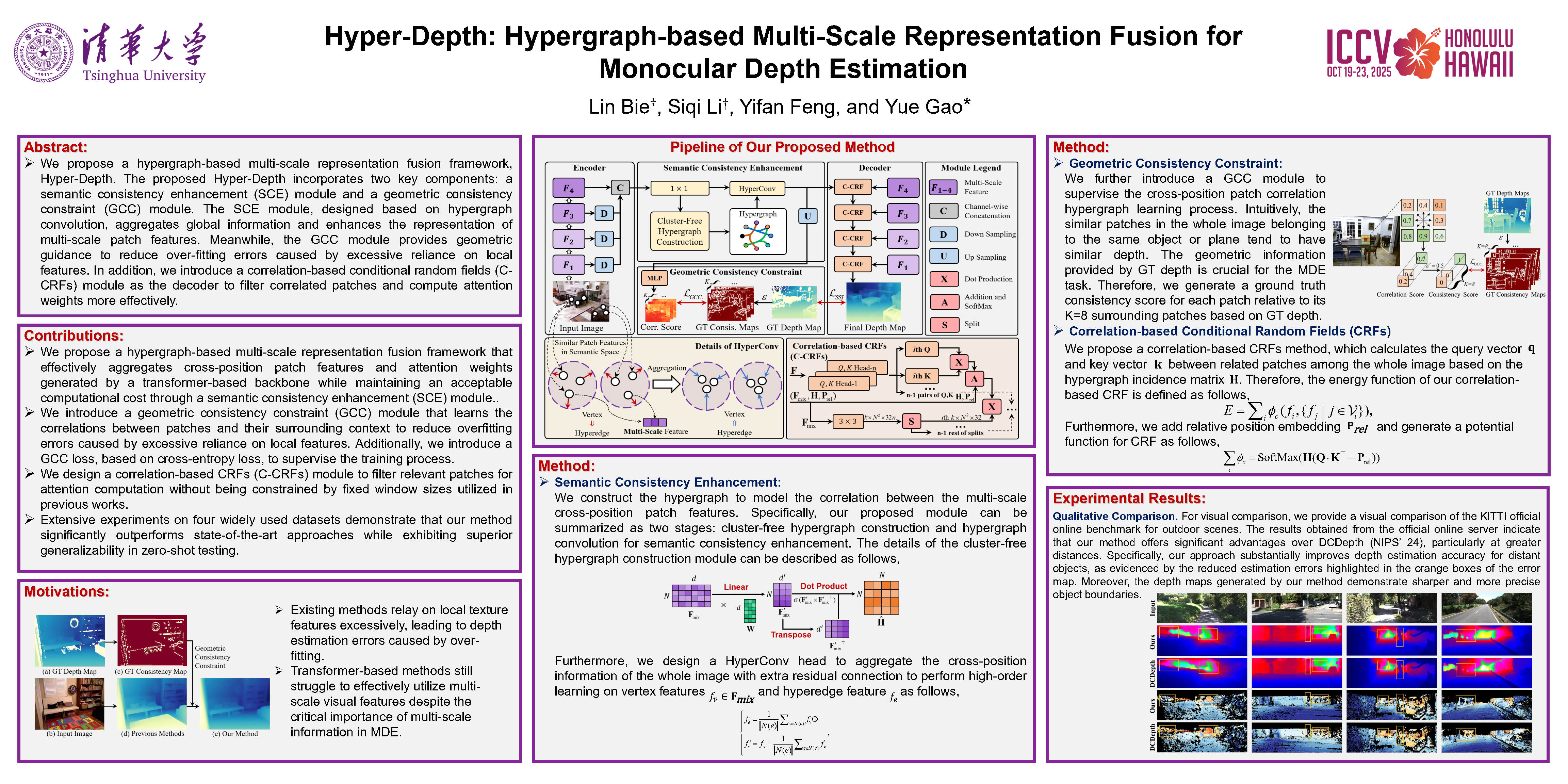 Monocular depth estimation (MDE) is a fundamental problem in computer vision with wide-ranging applications in various downstream tasks. While multi-scale features are perceptually critical for MDE, existing transformer-based methods have yet to leverage them explicitly. To address this limitation, we propose a hypergraph-based multi-scale representation fusion framework, Hyper-Depth.The proposed Hyper-Depth incorporates two key components: a Semantic Consistency Enhancement (SCE) module and a Geometric Consistency Constraint (GCC) module. The SCE module, designed based on hypergraph convolution, aggregates global information and enhances the representation of multi-scale patch features. Meanwhile, the GCC module provides geometric guidance to reduce over-fitting errors caused by excessive reliance on local features. In addition, we introduce a Correlation-based Conditional Random Fields (C-CRFs) module as the decoder to filter correlated patches and compute attention weights more effectively.Extensive experiments demonstrate that our method significantly outperforms state-of-the-art approaches across all evaluation metrics on the KITTI and NYU-Depth-v2 datasets, achieving improvements of 6.21% and 3.32% on the main metric RMSE, respectively. Furthermore, zero-shot evaluations on the nuScenes and SUN-RGBD datasets validate the generalizability of our approach.