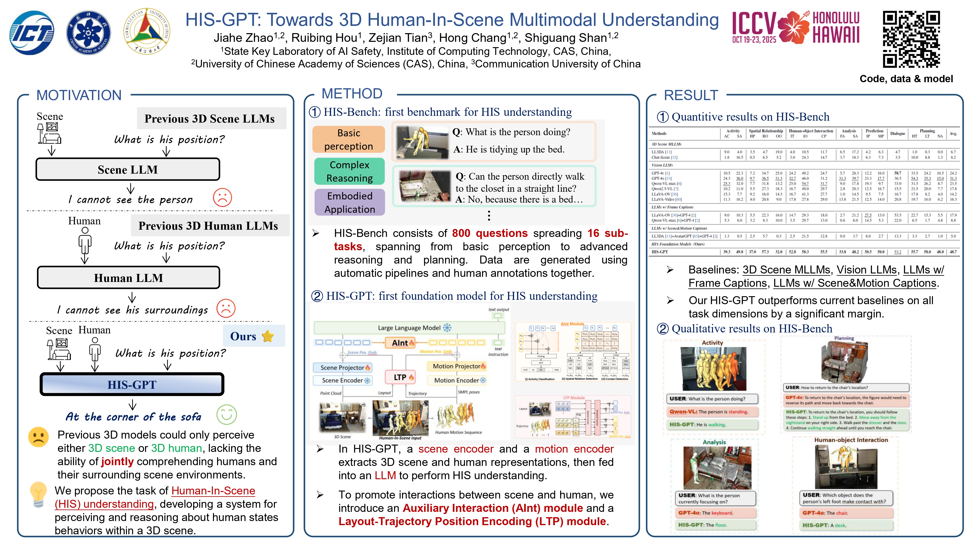 We propose a new task to benchmark human-in-scene understanding for embodied agents: Human-In-Scene Question Answering (HIS-QA). Given a human motion within a 3D scene, HIS-QA requires the agent to comprehend human states and behaviors, reason about its surrounding environment, and answer human-related questions within the scene. To support this new task, we present HIS-Bench, a multimodal benchmark that systematically evaluates HIS understanding across a broad spectrum, from basic perception to commonsense reasoning and planning. Our evaluation of various vision-language models on HIS-Bench reveals significant limitations in their ability to handle HIS-QA tasks. To this end, we propose HIS-GPT, the first foundation model for HIS understanding. HIS-GPT integrates 3D scene context and human motion dynamics into large language models while incorporating specialized mechanisms to capture human-scene interactions. Extensive experiments demonstrate that HIS-GPT sets a new state-of-the-art on HIS-QA tasks. We hope this work inspires future research of human behavior analysis in 3D scenes, advancing embodied AI and world models.