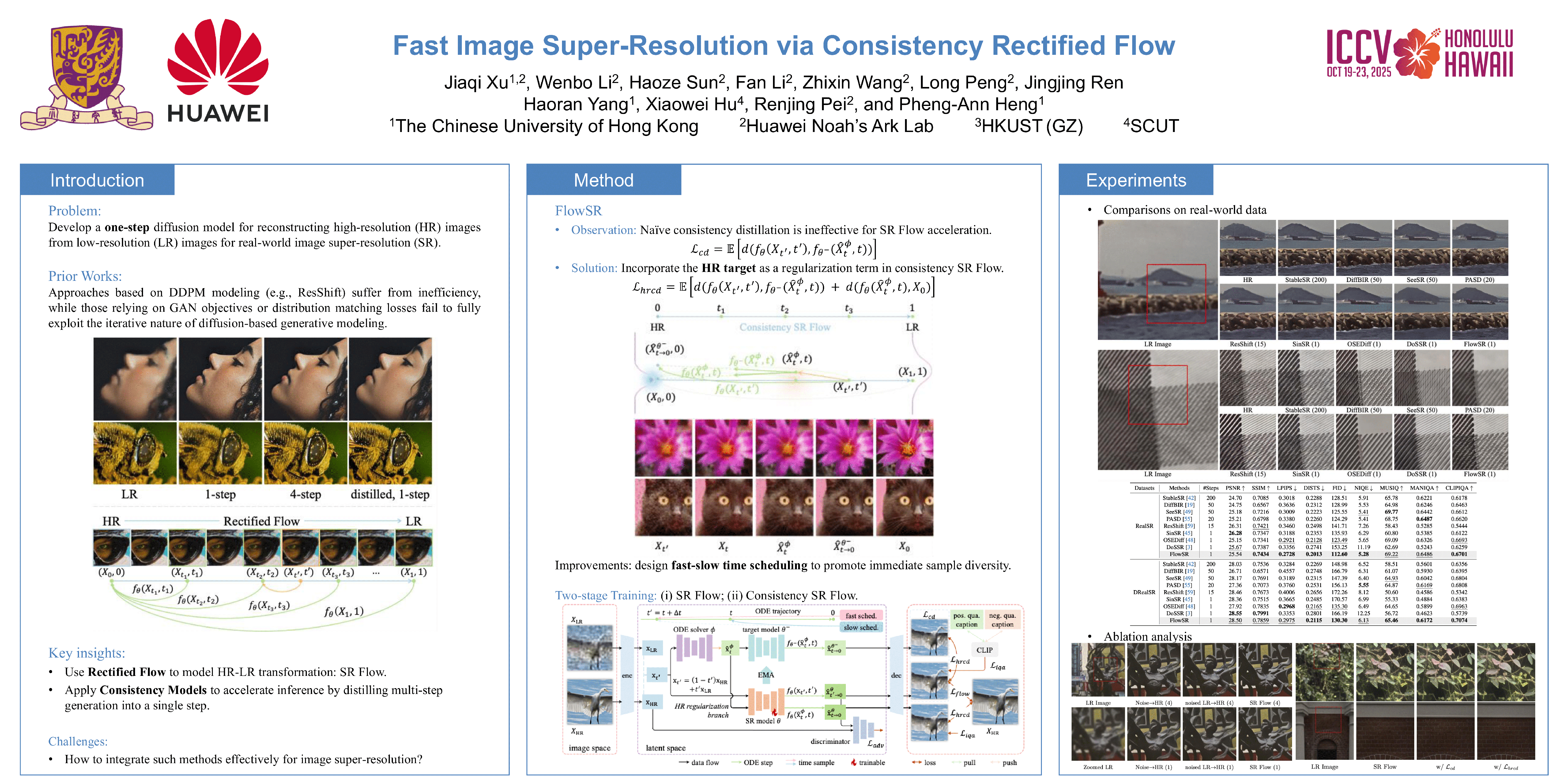 Diffusion models (DMs) have demonstrated remarkable success in real-world image super-resolution (SR), yet their reliance on time-consuming multi-step sampling largely hinders their practical applications. While recent efforts have introduced few- or single-step solutions, existing methods either inefficiently model the process from noisy input or fail to fully exploit iterative generative priors, compromising the fidelity and quality of the reconstructed images. To address this issue, we propose FlowSR, a novel approach that reformulates the SR problem as a rectified flow from low-resolution (LR) to high-resolution (HR) images. Our method leverages an improved consistency learning strategy to enable high-quality SR in a single step. Specifically, we refine the original consistency distillation process by incorporating HR regularization, ensuring that the learned SR flow not only enforces self-consistency but also converges precisely to the ground-truth HR target. Furthermore, we introduce a fast-slow scheduling strategy, where adjacent timesteps for consistency learning are sampled from two distinct schedulers: a fast scheduler with fewer timesteps to improve efficiency, and a slow scheduler with more timesteps to capture fine-grained texture details. This strategy enhances the model's robustness, enabling accurate restoration even when mild perturbations occur in the flow trajectory. Extensive experiments demonstrate that FlowSR achieves outstanding performance in both efficiency and image quality.