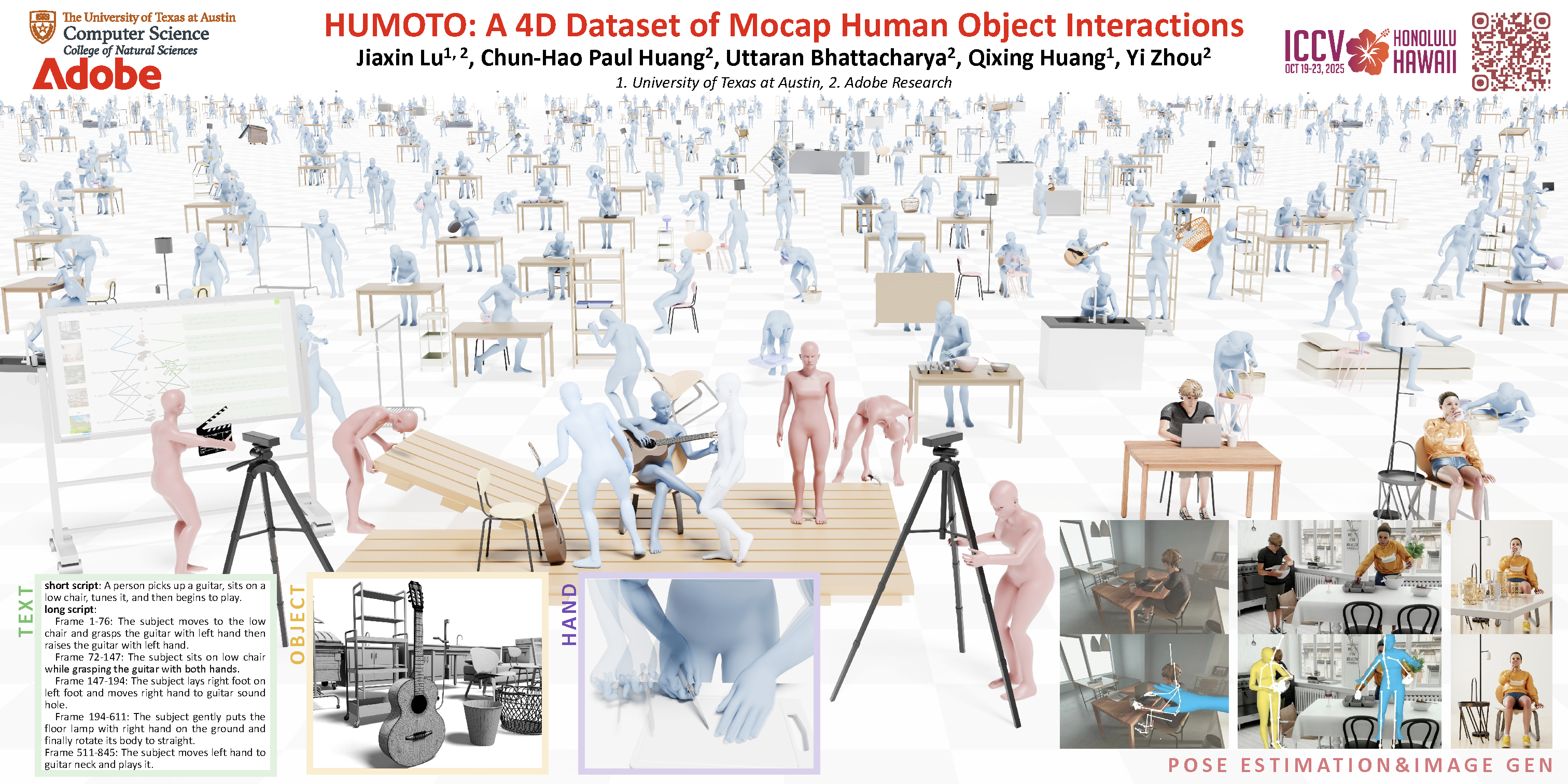 We present Human Motions with Objects (HUMOTO), a high-fidelity dataset of human-object interactions for motion generation, computer vision, and robotics applications. Featuring 736 sequences (7,875 seconds at 30 fps), HUMOTO captures interactions with 63 precisely modeled objects and 72 articulated parts. Our innovations include a scene-driven LLM scripting pipeline creating complete, purposeful tasks with natural progression, and a mocap-and-camera recording setup to effectively handle occlusions. Spanning diverse activities from cooking to outdoor picnics, HUMOTO preserves both physical accuracy and logical task flow. Professional artists rigorously clean and verify each sequence, minimizing foot sliding and object penetrations. We also provide benchmarks compared to other datasets. HUMOTO’s comprehensive full-body motion and simultaneous multi-object interactions address key data-capturing challenges and provide opportunities to advance realistic human-object interaction modeling across research domains with practical applications in animation, robotics, and embodied AI systems. Project: https://anonymous.4open.science/w/humoto-1782/ .