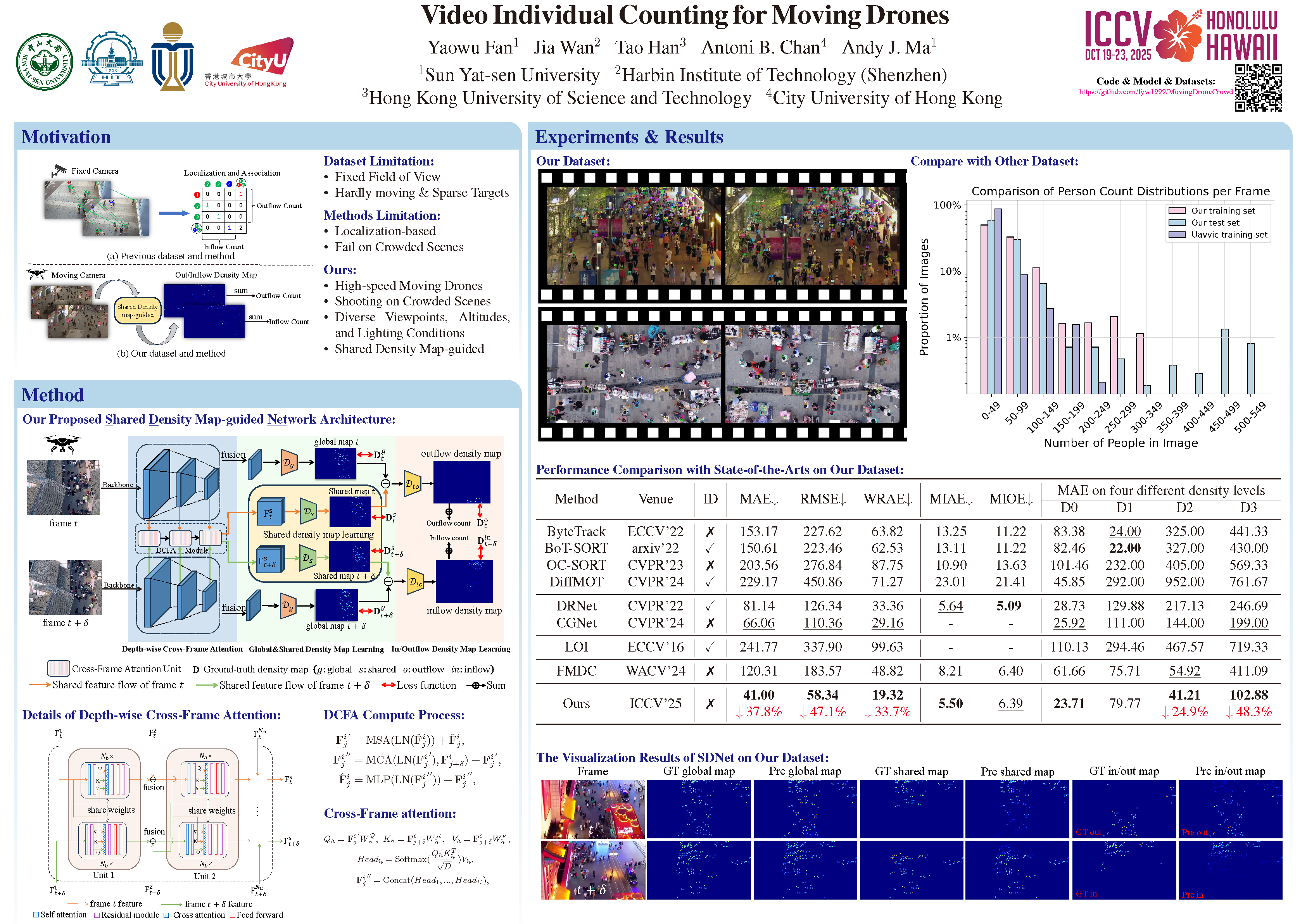 Video Individual Counting (VIC) has received increasing attentions recently due to its importance in intelligent video surveillance. Existing works are limited in two aspects, i.e., dataset and method. Previous crowd counting datasets are captured with fixed or rarely moving cameras with relatively sparse individuals, restricting evaluation for a highly varying view and time in crowded scenes. While VIC methods have been proposed based on localization-then-association or localization-then-classification, they may not perform well due to difficulty in accurate localization of crowded and small targets under challenging scenarios. To address these issues, we collect a MovingDroneCrowd Dataset and propose a density map based VIC method. Different from existing datasets, our dataset consists of videos captured by fast-moving drones in crowded scenes under diverse illuminations, shooting heights and angles. Other than localizing individuals, we propose a Depth-wise Cross-Frame Attention (DCFA) module, which directly estimate inflow and outflow density maps to learn shared density between consecutive frames. The inflow density maps across frames are summed up to obtain the number of unique pedestrians in a video. Experiments on our datasets and publicly available ones the the superiority of our method over the state of the arts for VIC in highly dynamic and complex crowded scenes. Our dataset and codes will be released publicly.