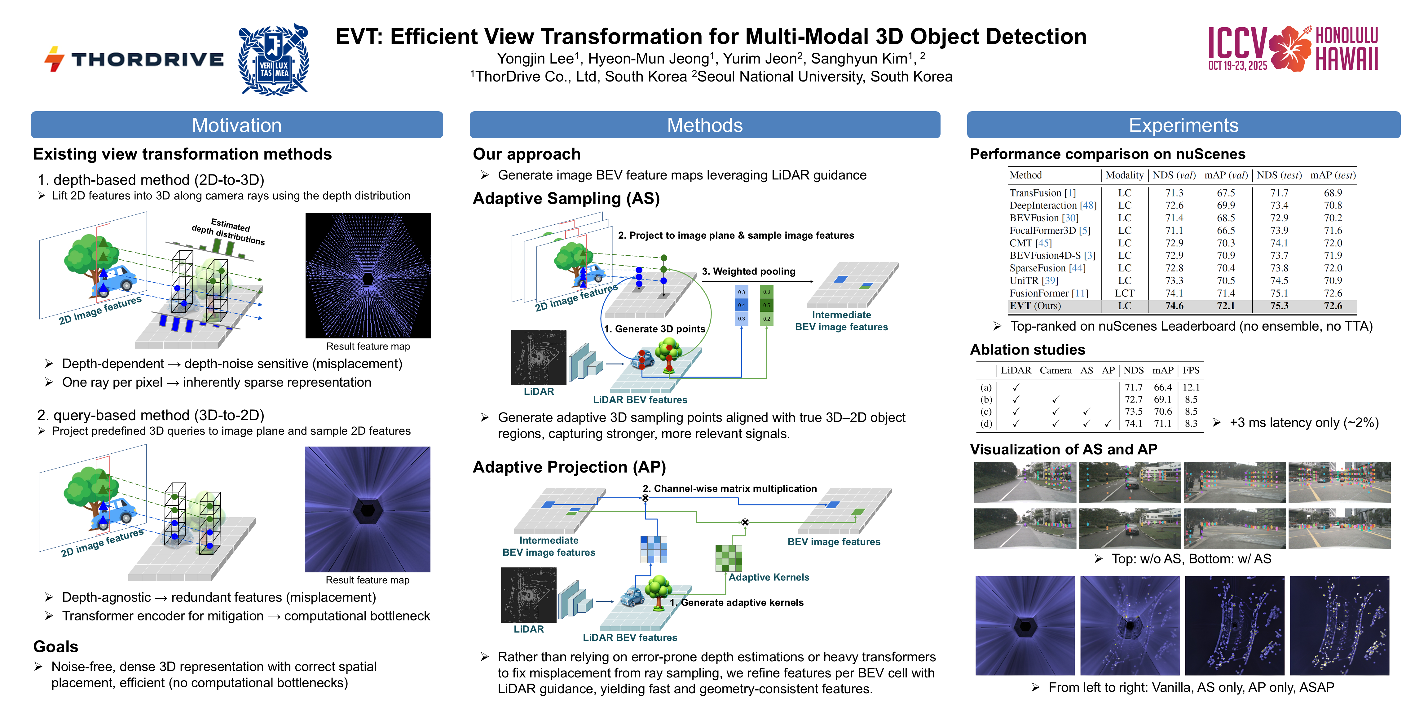 Multi-modal sensor fusion in Bird’s Eye View (BEV) representation has become the leading approach for 3D object detection. However, existing methods often rely on depth estimators or transformer encoders to transform image features into BEV space, which reduces robustness or introduces significant computational overhead. Moreover, the insufficient geometric guidance in view transformation results in ray-directional misalignments, limiting the effectiveness of BEV representations. To address these challenges, we propose Efficient View Transformation (EVT), a novel 3D object detection framework that constructs a well-structured BEV representation, improving both accuracy and efficiency. Our approach focuses on two key aspects. First, Adaptive Sampling and Adaptive Projection (ASAP), which utilizes LiDAR guidance to generate 3D sampling points and adaptive kernels, enables more effective transformation of image features into BEV space and a refined BEV representation. Second, an improved query-based detection framework, incorporating group-wise mixed query selection and geometry-aware cross-attention, effectively captures both the common properties and the geometric structure of objects in the transformer decoder. On the nuScenes test set, EVT achieves state-of-the-art performance of 75.3\% NDS with real-time inference speed.