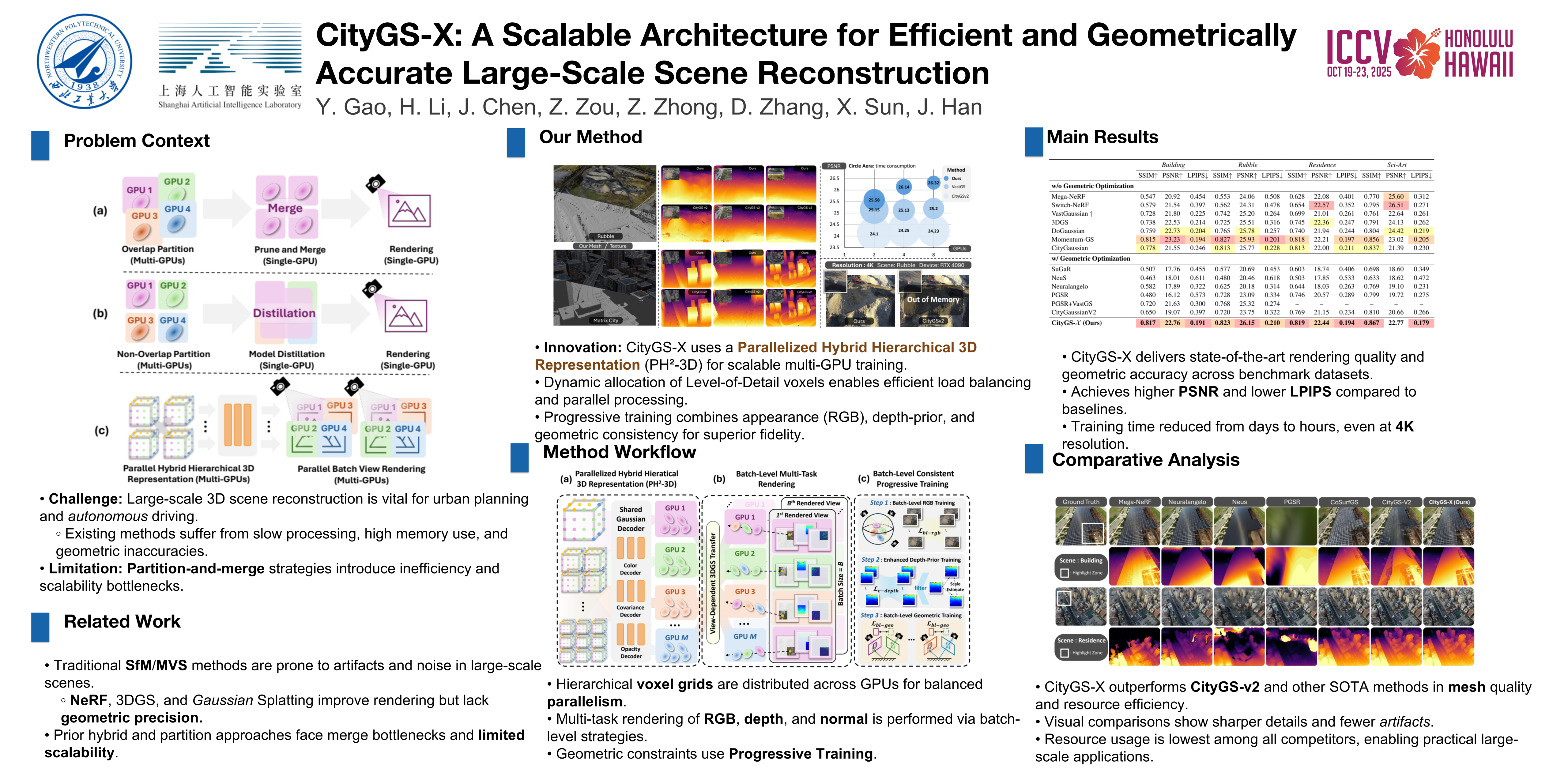 Despite its significant achievements in large-scale scene reconstruction, 3D Gaussian Splatting still faces substantial challenges, including slow processing, high computational costs, and limited geometric accuracy.These core issues arise from its inherently unstructured design and the absence of efficient parallelization.To overcome these challenges simultaneously, we introduce \textbf{CityGS-\(\mathcal{X}\)}, a scalable architecture built on a novel parallelized hybrid hierarchical 3D representation (PH$^2$-3D).As an early attempt, CityGS-\(\mathcal{X}\) abandons the cumbersome merge-and-partition process and instead adopts a newly-designed batch-level multi-task rendering process. This architecture enables efficient multi-GPU rendering through dynamic Level-of-Detail voxel allocations, significantly improving scalability and performance.%To further enhance both overall quality and geometric accuracy, CityGS-\(\mathcal{X}\) presents a progressive RGB-Depth-Normal training strategy.This approach enhances 3D consistency by jointly optimizing appearance and geometry representation through multi-view constraints and off-the-shelf depth priors within batch-level training.%Through extensive experiments, CityGS-\(\mathcal{X}\) consistently outperforms existing methods in terms of faster training times, larger rendering capacities, and more accurate geometric details in large-scale scenes. %Notably, CityGS-\(\mathcal{X}\) can train and render a 5,000+ image scene with only 4\(\times\)4090 GPUs in just 5 hours, while many other methods even encounter Out-Of-Memory (OOM) issues during rendering, making CityGS-\(\mathcal{X}\) a more accessible and scalable solution for this task.Notably, CityGS-\(\mathcal{X}\) can train and render a scene with 5,000+ images in just 5 hours using only 4×4090 GPUs, a task that would make other alternative methods encounter Out-Of-Memory (OOM) issues and fail completely. This implies that CityGS-\(\mathcal{X}\) is far beyond the capacity of other existing methods.