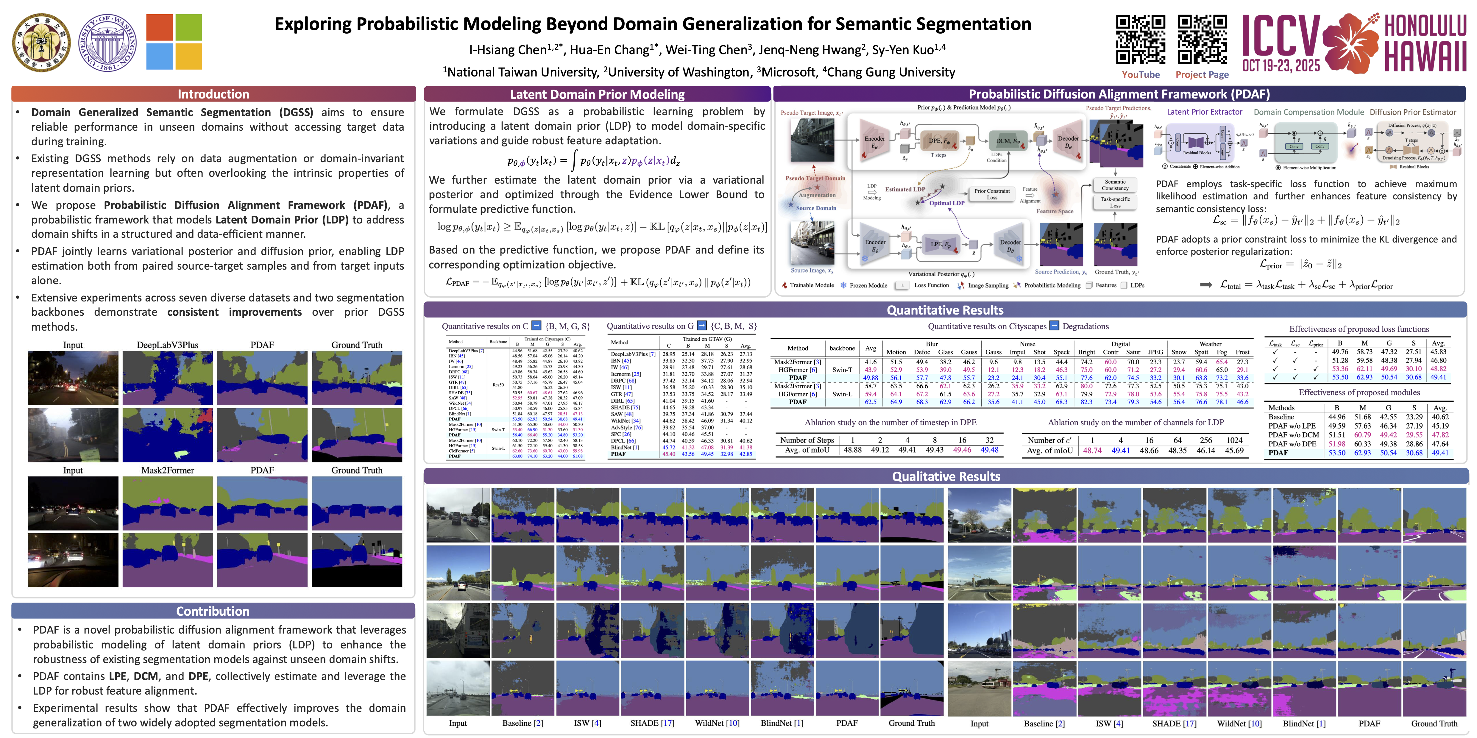 Domain Generalized Semantic Segmentation (DGSS) is a critical yet challenging task, as domain shifts in unseen environments can severely compromise model performance. While recent studies enhance feature alignment by projecting features into the source domain, they often neglect intrinsic latent domain priors, leading to suboptimal results. In this paper, we introduce PDAF, a Probabilistic Diffusion Alignment Framework that enhances the generalization of existing segmentation networks through probabilistic diffusion modeling. PDAF introduces a Latent Domain Prior (LDP) to capture domain shifts and uses this prior as a conditioning factor to align both source and unseen target domains. To achieve this, PDAF integrates into a pre-trained segmentation model and utilizes paired source and pseudo-target images to simulate latent domain shifts, enabling LDP modeling. The framework comprises three modules: the Latent Prior Extractor (LPE) predicts the LDP by supervising domain shifts; the Domain Compensation Module (DCM) adjusts feature representations to mitigate domain shifts; and the Diffusion Prior Estimator (DPE) leverages a diffusion process to estimate the LDP without requiring paired samples. This design enables PDAF to iteratively model domain shifts, progressively refining feature representations to enhance generalization under complex target conditions. Extensive experiments validate the effectiveness of PDAF across diverse and challenging urban scenes.
