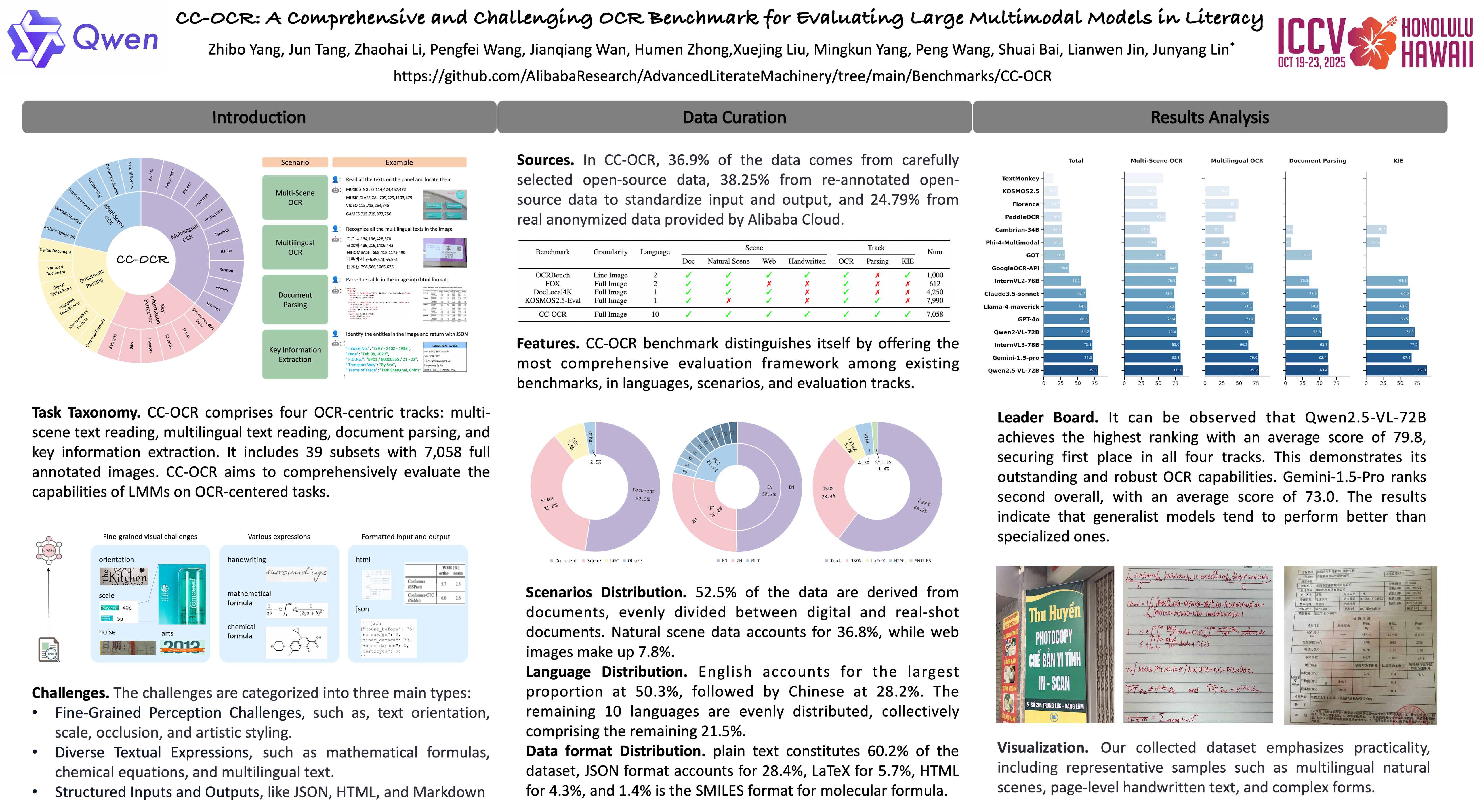 Large Multimodal Models ( LMMs ) have demonstrated impressive performance in recognizing document images with natural language instructions. However, it remains unclear to what extent capabilities in literacy with rich structure and fine-grained visual challenges. The current landscape lacks a comprehensive benchmark to effectively measure the literate capabilities of LMMs. Existing benchmarks are often limited by narrow scenarios and specified tasks. To this end, we introduce CC-OCR, a comprehensive benchmark that possesses a diverse range of scenarios, tasks, and challenges. CC-OCR comprises four OCR-centric tracks: multi-scene text reading, multilingual text reading, document parsing, and key information extraction. It includes 39 subsets with 7,058 full annotated images, of which 41% are sourced from real applications, and released for the first time. We evaluate ten prominent LMMs and reveal both the strengths and weaknesses of these models, particularly in text grounding, multi-orientation, and hallucination of repetition. CC-OCR aims to comprehensively evaluate the capabilities of LMMs on OCR-centered tasks, facilitating continued progress in this crucial area.