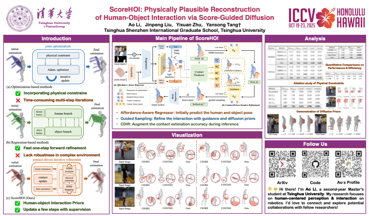 Joint reconstruction of human-object interaction marks a significant milestone in comprehending the intricate interrelations between humans and their surrounding environment. Nevertheless, previous optimization methods often struggle to achieve physically plausible reconstruction results due to the lack of prior knowledge about human-object interactions. In this paper, we introduce ScoreHOI, an effective diffusion-based optimizer that introduces diffusion priors for the precise recovery of human-object interactions. By harnessing the controllability within score-guided sampling, the diffusion model can reconstruct a conditional distribution of human and object pose given the image observation and object feature. During inference, the ScoreHOI effectively improves the reconstruction results by guiding the denoising process with specific physical constraints. Furthermore, we propose a contact-driven iterative refinement approach to enhance the contact plausibility and improve the reconstruction accuracy. Extensive evaluations on standard benchmarks demonstrate ScoreHOI’s superior performance over state-of-the-art methods, highlighting its ability to achieve a precise and robust improvement in joint human-object interaction reconstruction.