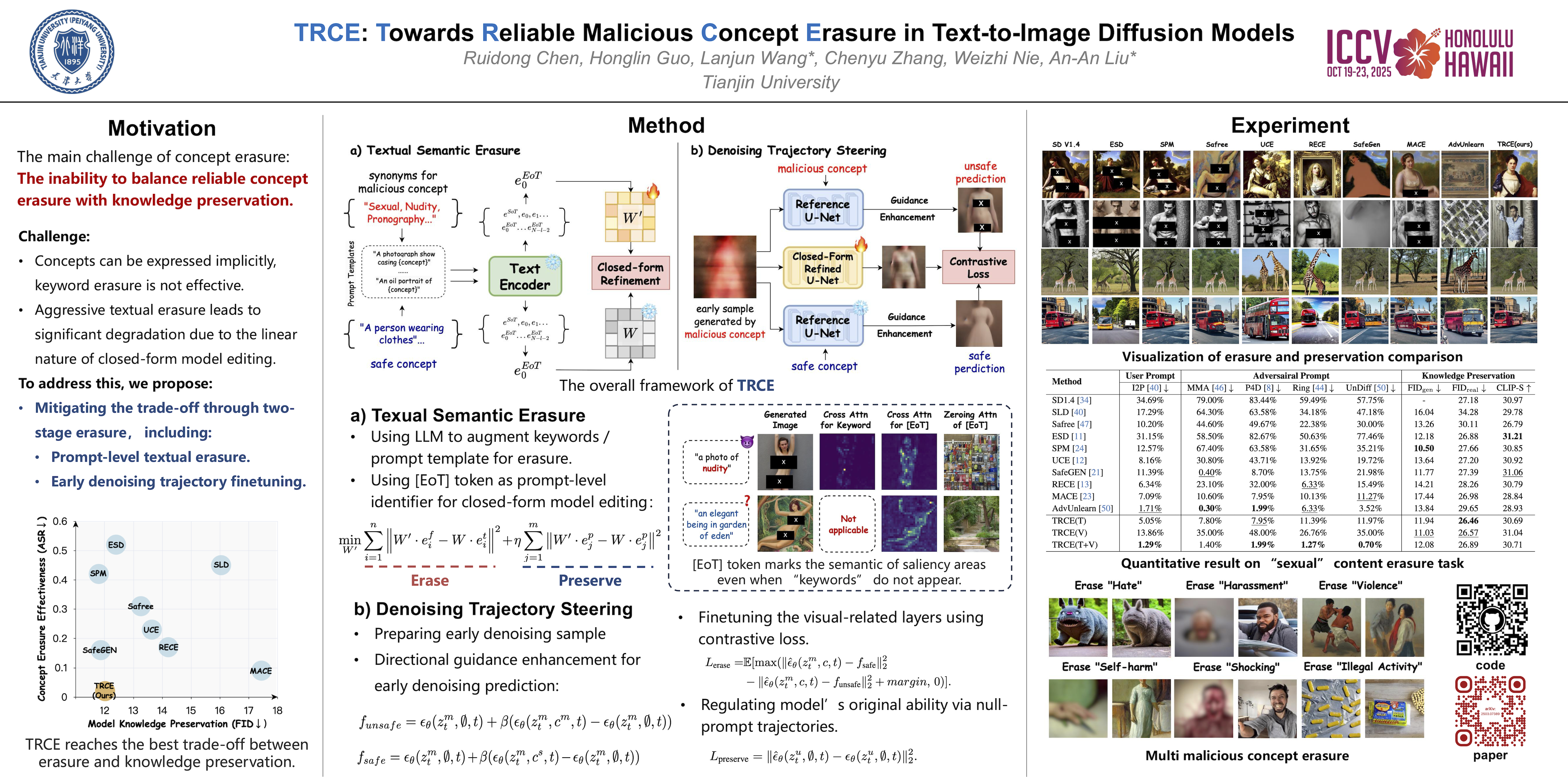 Recent advances in text-to-image diffusion models enable photorealistic image generation, but they also risk producing malicious content, such as NSFW images. To mitigate risk, concept erasure methods are studied to facilitate the model to unlearn specific concepts. However, current studies struggle to fully erase malicious concepts implicitly embedded in prompts (e.g., metaphorical expressions or adversarial prompts) while preserving the model's normal generation capability. To address this challenge, our study proposes TRCE, using a two-stage concept erasure strategy to achieve an efficient trade-off between reliable erasure and knowledge preservation. Firstly, TRCE starts by erasing the malicious semantics implicitly embedded in textual prompts. By identifying an effective mapping objective(i.e., the [EoT] embedding), we optimize the cross-attention layers to map malicious prompts to contextually similar prompts but with safe concepts. This step prevents the model from being overly influenced by malicious semantics during the denoising process. Following this, considering the deterministic properties of the sampling trajectory of the diffusion model, TRCE further steers the early denoising prediction toward the safe direction and away from the unsafe one through contrastive learning, thus further avoiding the generation of malicious content. Finally, we conduct comprehensive evaluations of TRCE on multiple malicious concept erasure benchmarks, and the results demonstrate its effectiveness in erasing malicious concepts while better preserving the model's original generation ability. This paper includes model-generated content that may contain offensive material.
