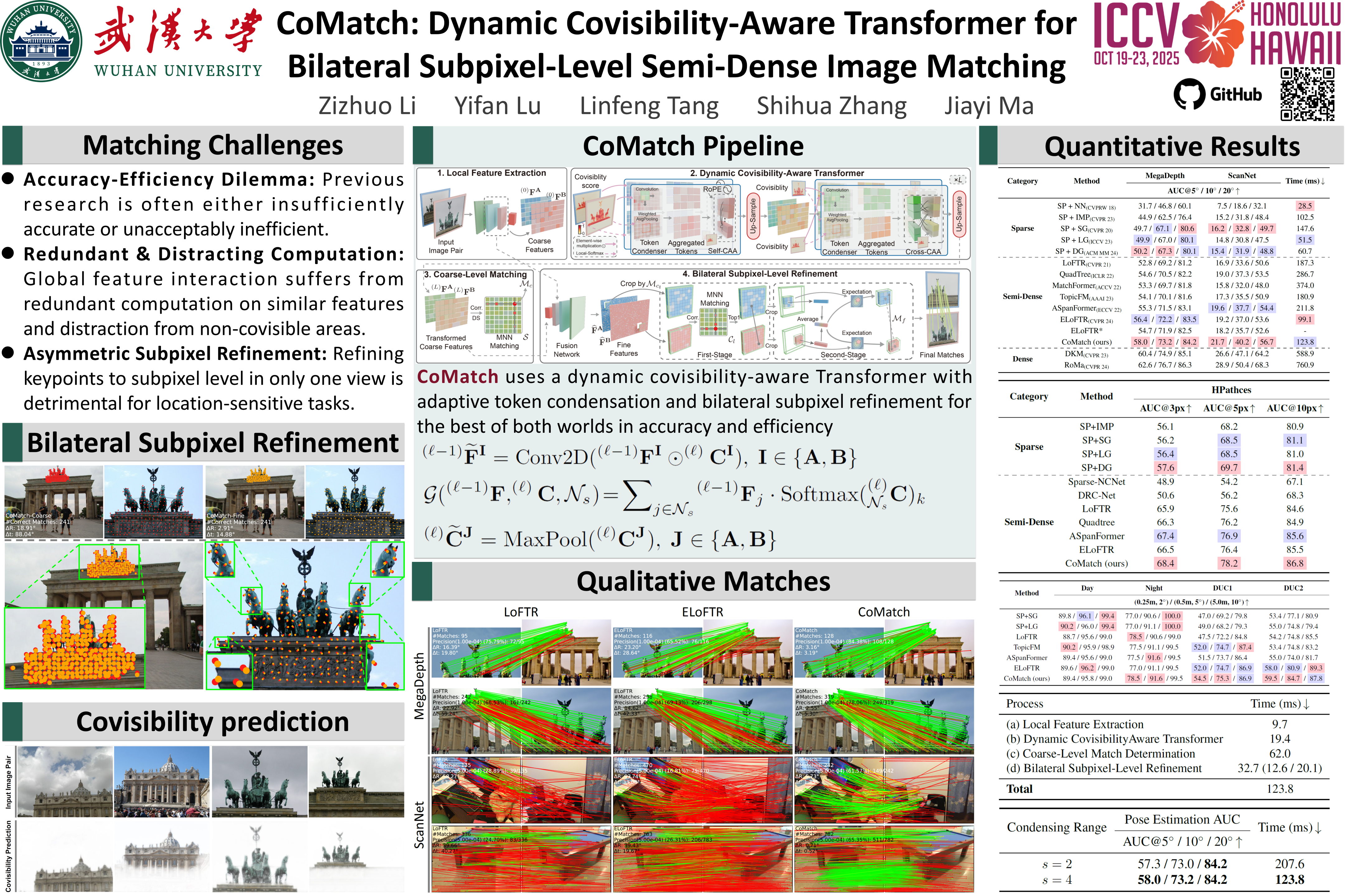 This prospective study proposes CoMatch, a novel semi-dense image matcher with dynamic covisibility awareness and bilateral subpixel accuracy. Firstly, observing that modeling context interaction over the entire coarse feature map elicits highly redundant computation due to the neighboring representation similarity of tokens, a covisibility-guided token condenser is introduced to adaptively aggregate tokens in light of their covisibility scores that are dynamically estimated, thereby ensuring computational efficiency while improving the representational capacity of aggregated tokens simultaneously. Secondly, considering that feature interaction with massive non-covisible areas is distracting, which may degrade feature distinctiveness, a covisibility-assisted attention mechanism is deployed to selectively suppress irrelevant message broadcast from non-covisible reduced tokens, resulting in robust and compact attention to relevant rather than all ones. Thirdly, we find that at the fine-level stage, current methods adjust only the target view's keypoints to subpixel level, while those in the source view remain restricted at the coarse level and thus not informative enough, detrimental to keypoint location-sensitive usages. A simple yet potent fine correlation module is developed to refine the matching candidates in both source and target views to subpixel level, attaining attractive performance improvement. Thorough experimentation across an array of public benchmarks affirms CoMatch’s promising accuracy, efficiency, and generalizability.