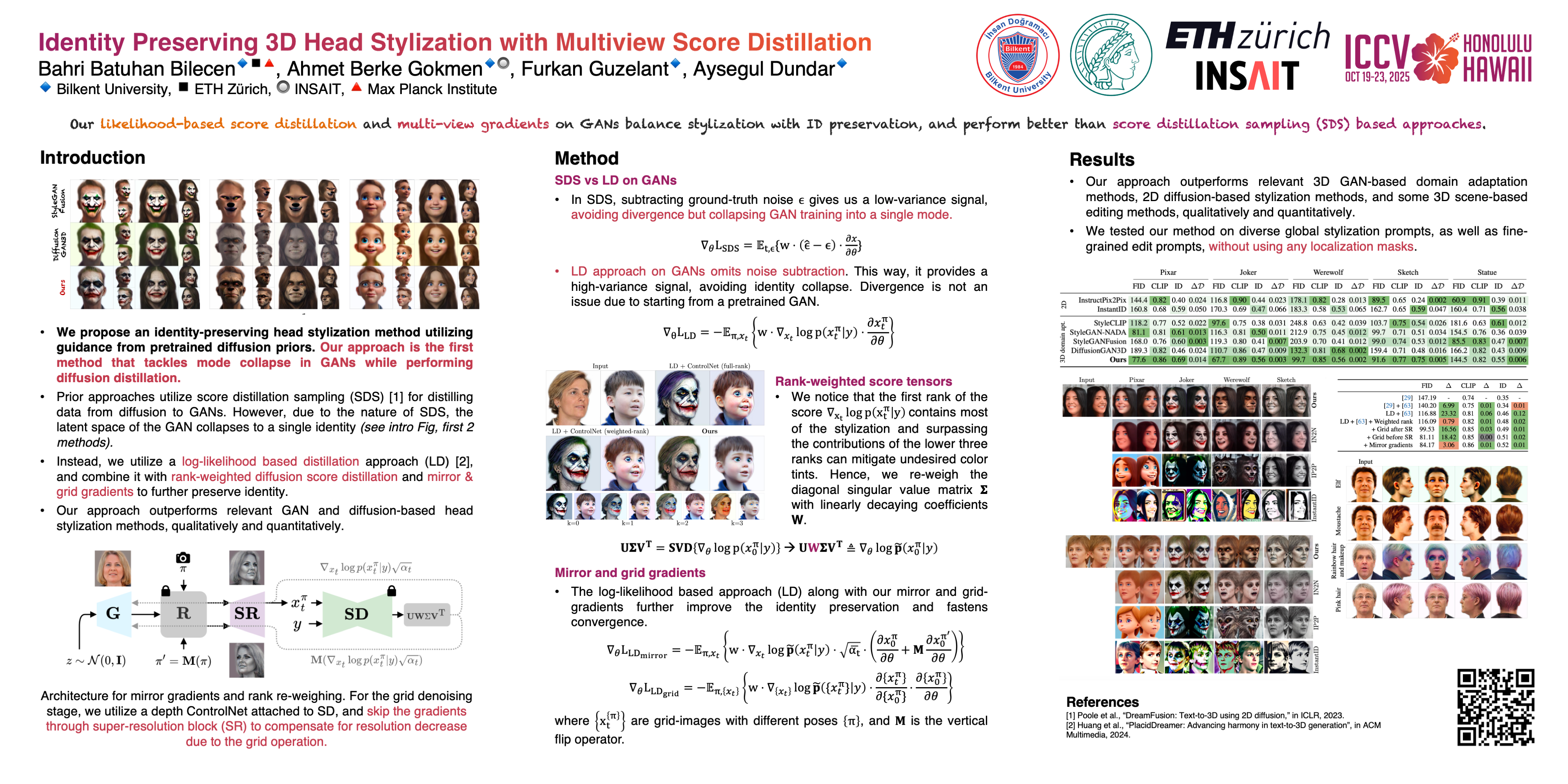 3D head stylization transforms realistic facial features into artistic representations, enhancing user engagement across applications such as gaming and virtual reality. While 3D-aware generators have made significant advancements, many 3D stylization methods primarily provide near-frontal views and struggle to preserve the unique identities of original subjects, often resulting in outputs that lack diversity and individuality. Leveraging the PanoHead model which provides 360-degree consistent renders, we propose a novel framework that employs negative log-likelihood distillation (LD) to enhance identity preservation and improve stylization quality. By integrating multi-view grid score and mirror gradients within the 3D GAN architecture and introducing a score rank weighing technique, our approach achieves substantial qualitative and quantitative improvements. Our findings not only advance the state of 3D head stylization but also provide valuable insights into effective distillation processes between diffusion models and GANs, focusing on the critical issue of identity preservation. Code will be publicly released.