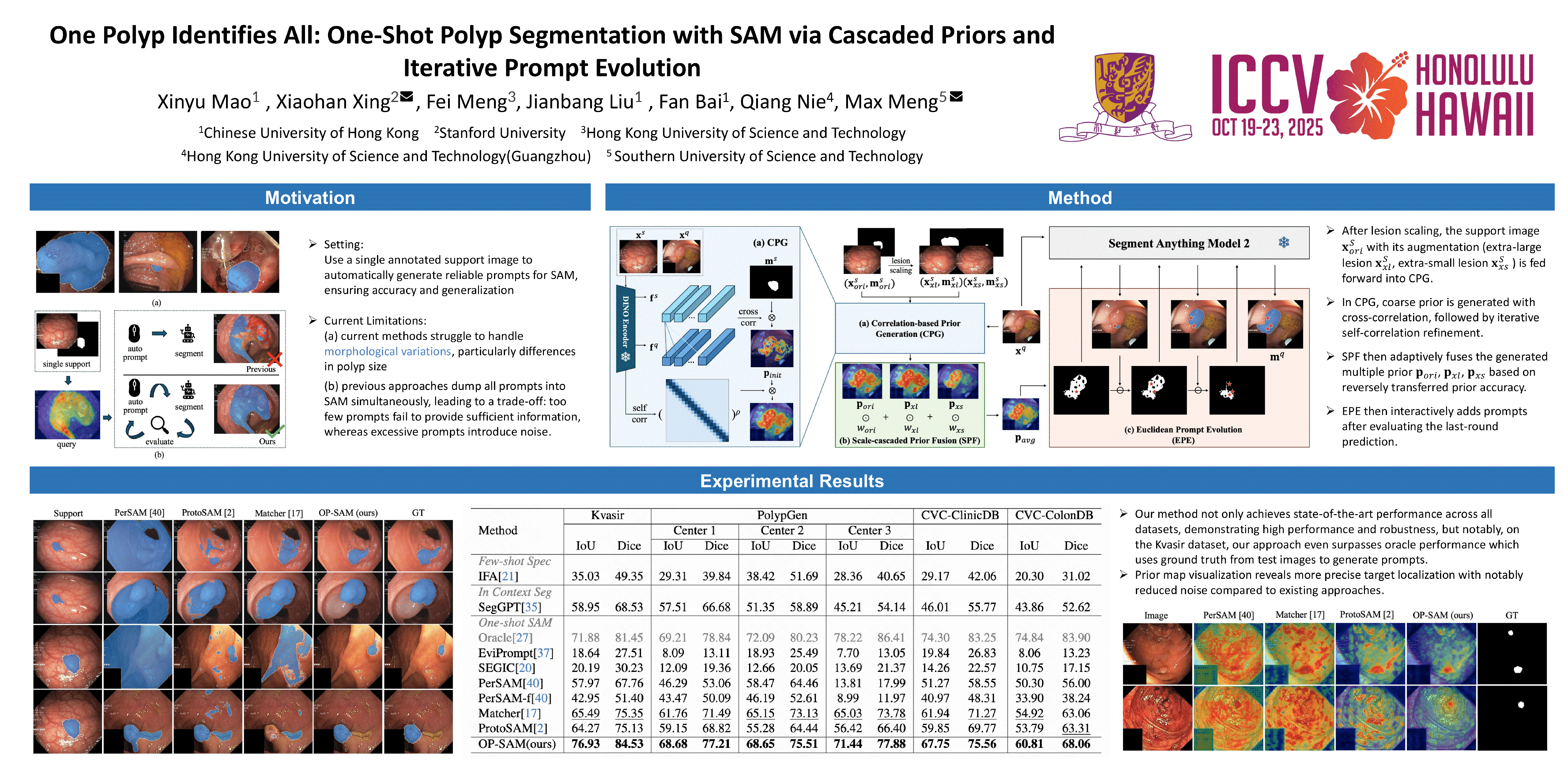 Polyp segmentation is vital for early colorectal cancer detection, yet traditional fully supervised methods struggle with morphological variability and domain shifts, requiring frequent retraining. Additionally, reliance on large-scale annotations is a major bottleneck due to the time-consuming and error-prone nature of polyp boundary labeling. Recently, vision foundation models like Segment Anything Model (SAM) have demonstrated strong generalizability and fine-grained boundary detection with sparse prompts, effectively addressing key polyp segmentation challenges. However, SAM’s prompt-dependent nature limits automation in medical applications, since manually inputting prompts for each image is labor-intensive and time-consuming. We propose OP-SAM, a One-shot Polyp segmentation framework based on SAM that automatically generates prompts from a single annotated image, ensuring accurate and generalizable segmentation without additional annotation burdens. Our method introduces Correlation-based Prior Generation (CPG) for semantic label transfer and Scale-cascaded Prior Fusion (SPF) to adapt to polyp size variations as well as filter out noisy transfers. Instead of dumping all prompts at once, we devise Euclidean Prompt Evolution (EPE) for iterative prompt refinement, progressively enhancing segmentation quality. Extensive evaluations across five datasets validate OP-SAM’s effectiveness. Notably, on Kvasir, it achieves 76.93% IoU, surpassing the state-of-the-art by 11.44%. Source codes will be released upon acceptance.