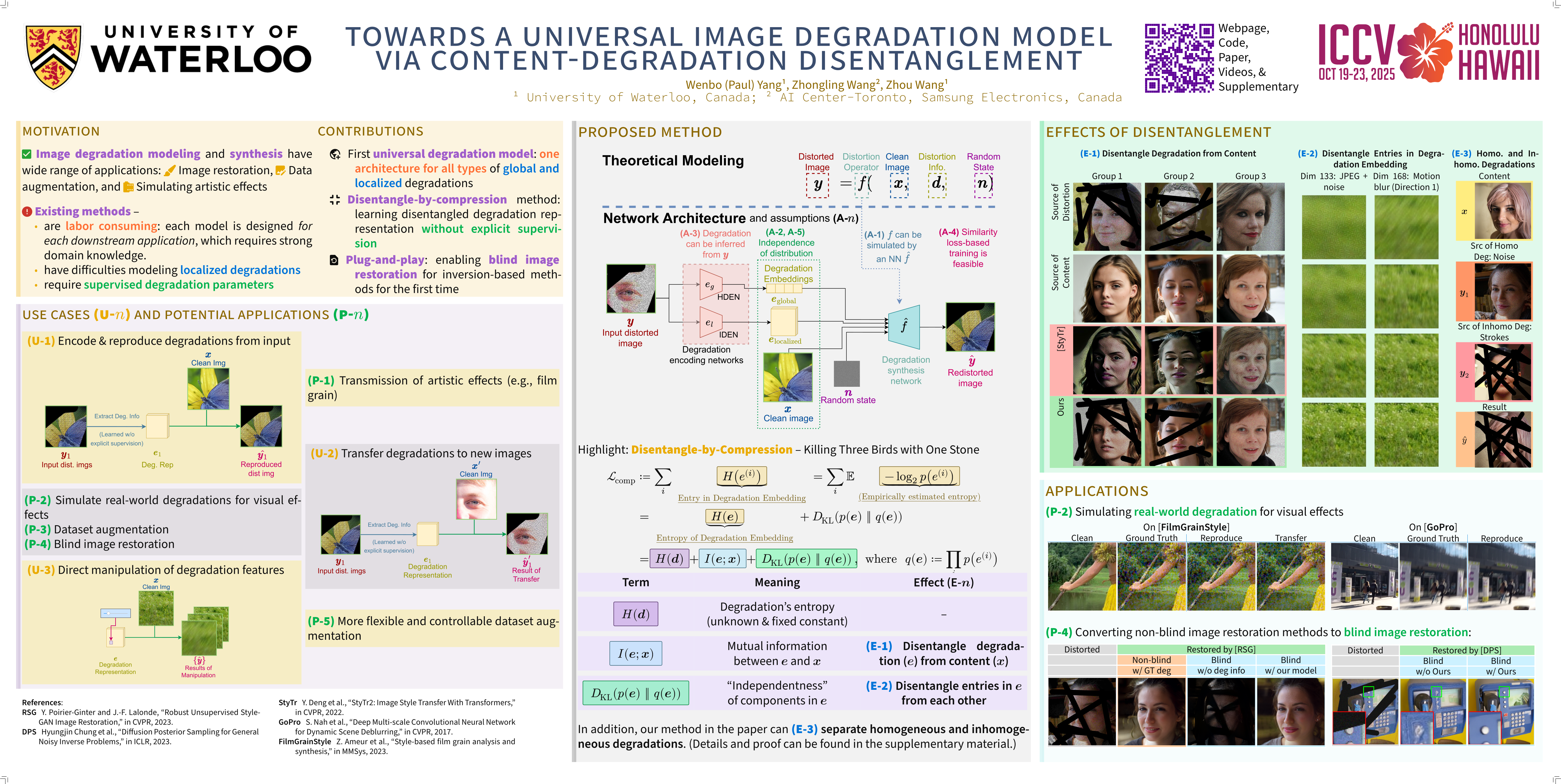Image degradation synthesis is highly desirable in a wide variety of applications ranging from image restoration to simulating artistic effects. Existing models are designed to generate one specific or a narrow set of degradations, which often require user-provided degradation parameters. As a result, they lack the generalizability to synthesize degradations beyond their initial design or adapt to other applications. Here we propose the first universal degradation model that can synthesize a broad spectrum of complex and realistic degradations containing both homogeneous (global) and inhomogeneous (spatially varying) components. Our model automatically extracts and disentangles homogeneous and inhomogeneous degradation features, which are later used for degradation synthesis without user intervention. A disentangle-by-compression method is proposed to separate degradation information from images. Two novel modules for extracting and incorporating inhomogeneous degradations are created to model inhomogeneous components in complex degradations. We demonstrate the model’s accuracy and adaptability in film-grain simulation and blind image restoration tasks. The demo video (anonymized version available supplementary material), code, and dataset of this project will be released.