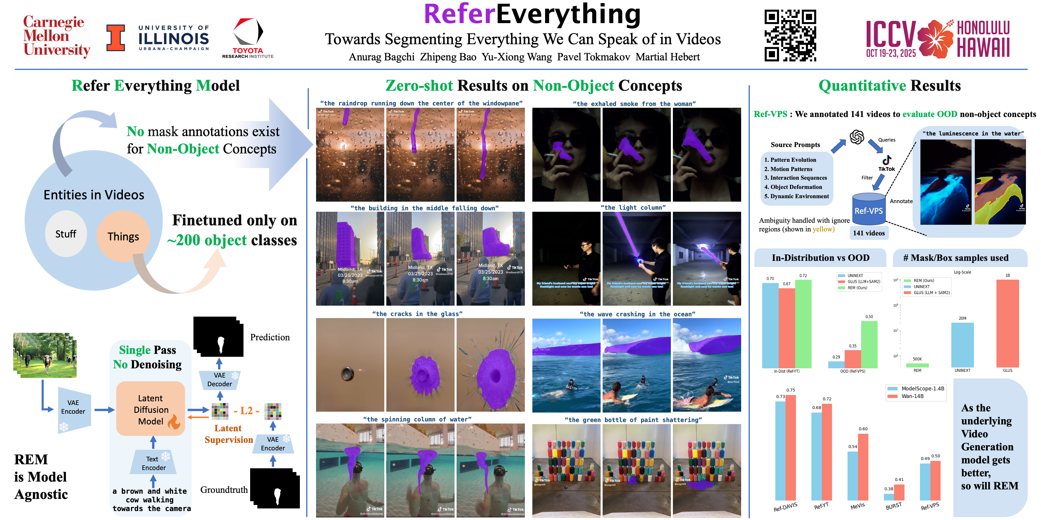 We present REM, a framework for segmenting a wide range of concepts in video that can be described through natural language. Our method unlocks the universal visual-language mapping learned by video diffusion models on Internet-scale data by fine-tuning them on small-scale Referring Object Segmentation datasets. Our key insight is preserving the entirety of the generative model's architecture by shifting its objective from predicting noise to predicting mask latents. The resulting model can accurately segment and track rare and unseen objects, despite only being trained on object masks from a limited set of categories. Additionally, it can effortlessly generalize to non-object dynamic concepts, such as smoke or raindrops, as demonstrated in our newly introduced benchmark for Referring Video Process Segmentation (Ref-VPS). Our experiments show that REM performs on par with state-of-the-art approaches on in-domain datasets, like Ref-DAVIS, while outperforming them by up to 11 points in terms of region similarity out-of-domain, leveraging the power of Internet-scale pre-training.