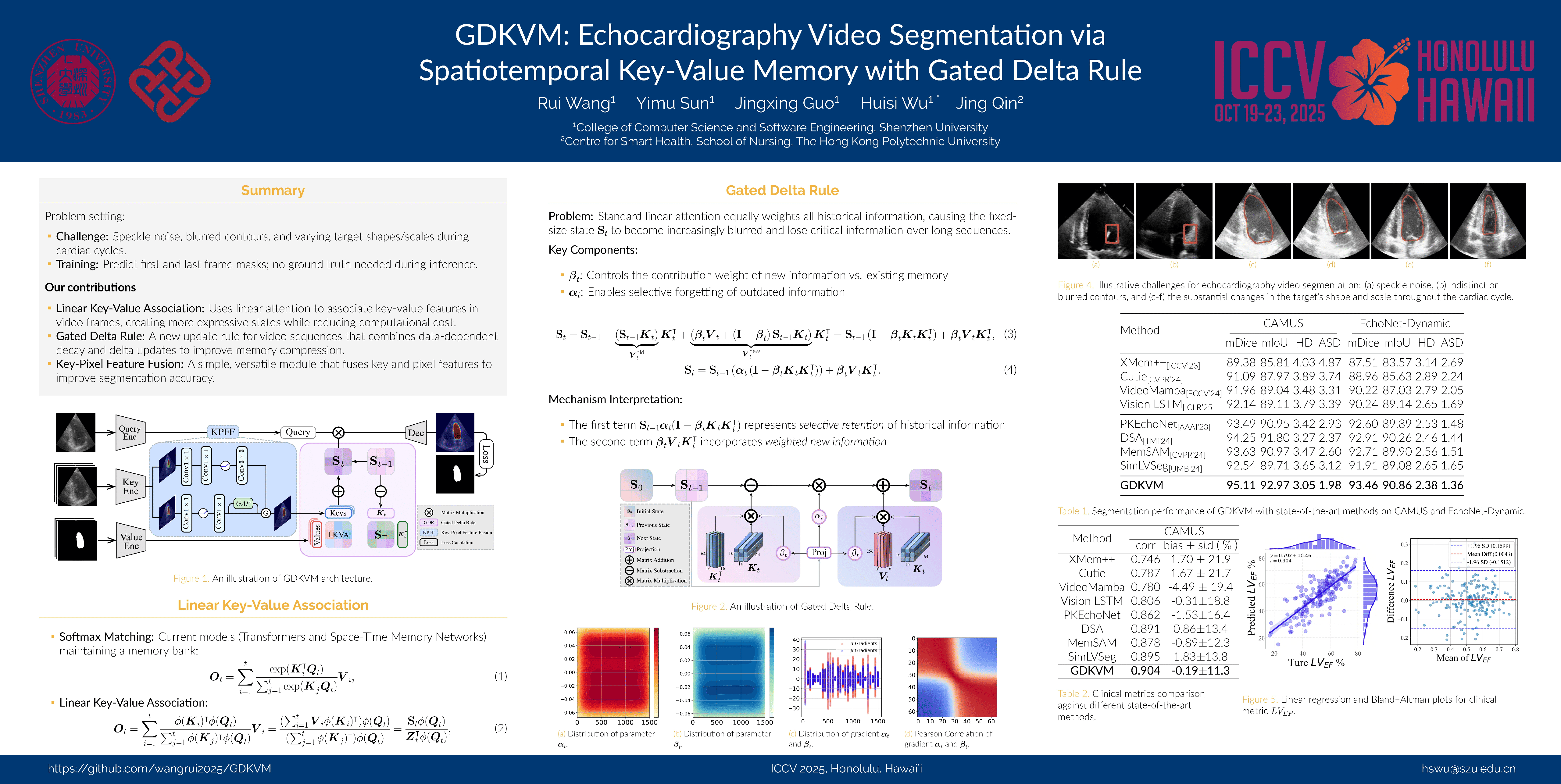 Accurate segmentation of cardiac chamber structures in echocardiogram sequences is of great significance for clinical diagnosis and treatment. The imaging noise, artifacts, and the deformation and motion of the heart pose challenges to segmentation algorithms. Existing methods based on convolutional neural networks, Transformers, and space-time memory have indeed improved segmentation accuracy to some extent, but they are often restricted by limited local receptive fields and insufficient temporal memory retrieval.In this paper, we propose a novel model for echocardiography video segmentation, called GDKVM. The model employs linear key-value associations (LKVA) to effectively model inter-frame correlations, and introduces the gated delta rule (GDR) to ideally store intermediate memory states. The key-pixel feature fusion (KPFF) module is designed to integrate local and global features at multiple scales, enhancing robustness against boundary blurring and noise interference. We validated GDKVM on two mainstream echocardiogram video datasets (CAMUS and EchoNet-Dynamic) and compared it with various state-of-the-art methods. Experimental results show that GDKVM outperforms existing approaches in terms of segmentation accuracy and robustness, while ensuring real-time performance. GDKVM provides more accurate and efficient cardiac chamber segmentation outcomes for clinical applications.The code will be released upon publication.