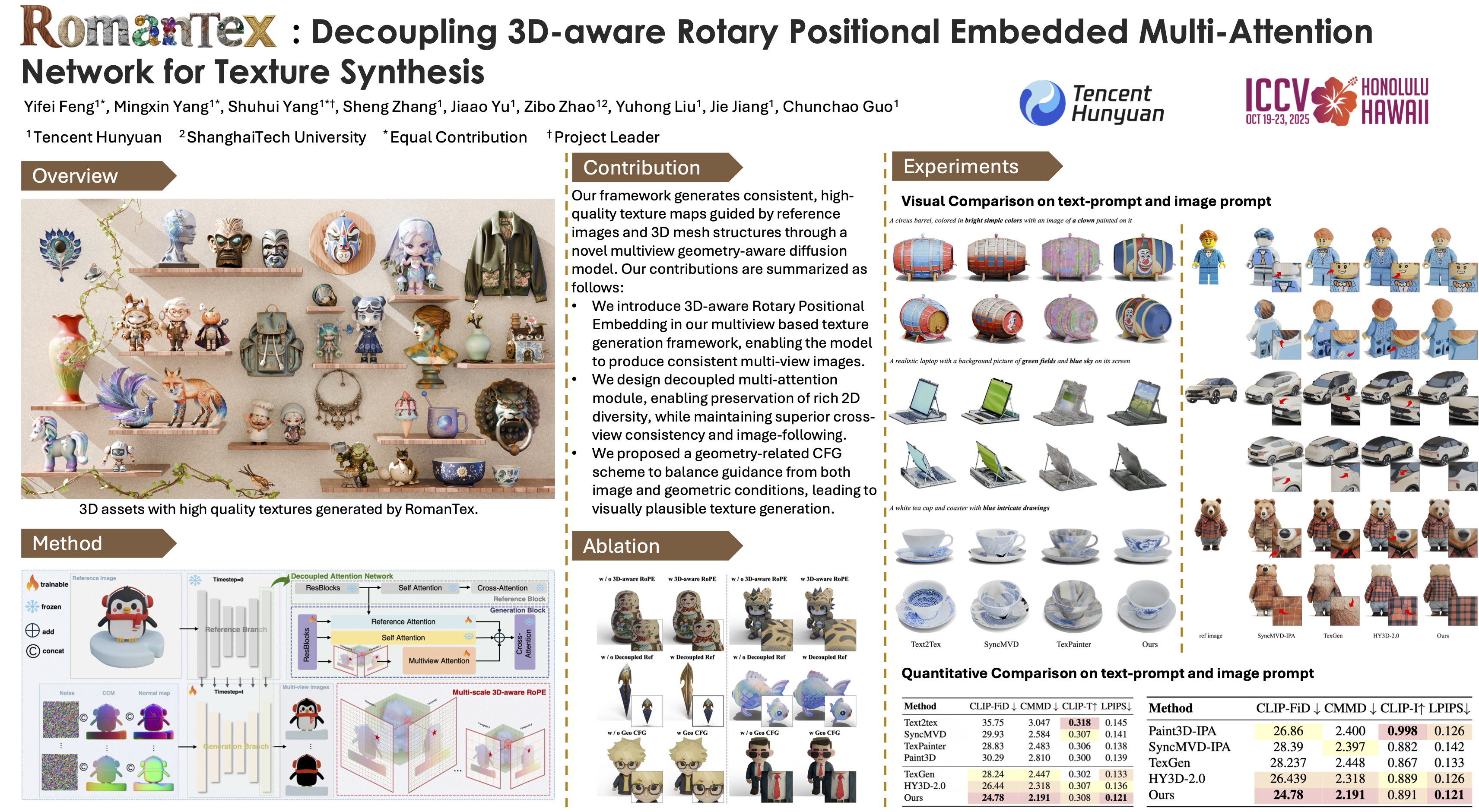 Painting textures for existing geometries is a critical yet labor-intensive process in 3D asset generation. Recent advancements in text-to-image (T2I) models have led to significant progress in texture generation. Most existing research approaches this task by first generating images in 2D spaces using image diffusion models, followed by a texture baking process to achieve UV texture. However, these methods often struggle to produce high-quality textures due to inconsistencies among the generated multi-view images, resulting in seams and ghosting artifacts. In contrast, 3D-based texture synthesis methods aim to address these inconsistencies, but they often neglect 2D diffusion model priors, making them challenging to apply to real-world objectsTo overcome these limitations, we propose RomanTex, a multiview-based texture generation framework that integrates a multi-attention network with an underlying 3D representation, facilitated by our novel 3D-aware Rotary Positional Embedding. Additionally, we incorporate a decoupling characteristic in the multi-attention block to enhance the model's robustness in image-to-texture task, enabling semantically-correct back-view synthesis.Furthermore, we introduce a geometry-related Classifier-Free Guidance (CFG) mechanism to further improve the alignment with both geometries and images.Quantitative and qualitative evaluations, along with comprehensive user studies, demonstrate that our method achieves state-of-the-art results in texture quality and consistency.