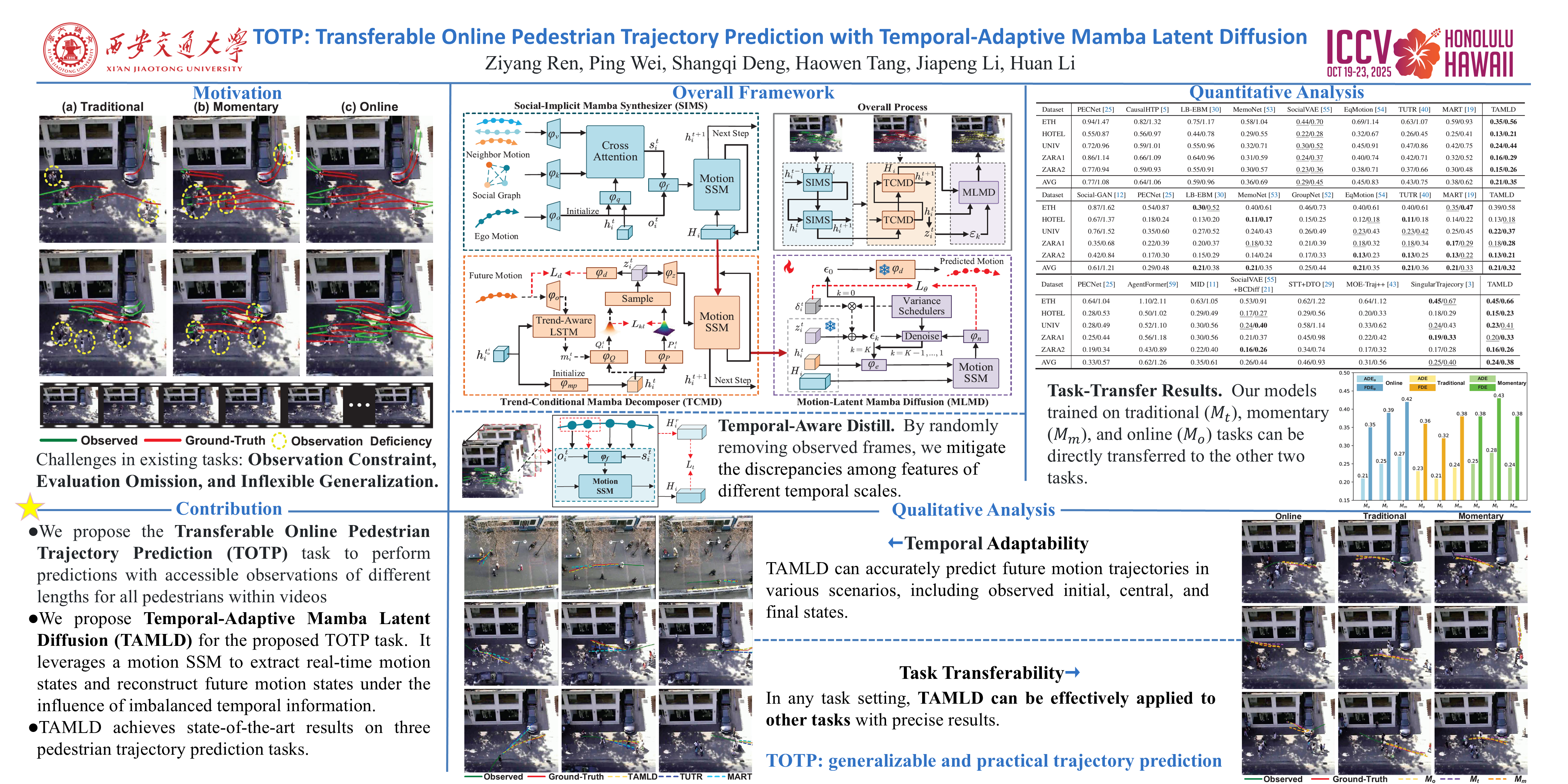 Pedestrian trajectory prediction is crucial for many intelligent tasks. While existing methods predict future trajectories from fixed-frame historical observations, they are limited by the observational perspective and the need for extensive historical information, resulting in prediction delays and inflexible generalization in real-time systems. In this paper, we propose a novel task called Transferable Online Pedestrian Trajectory Prediction (TOTP), which synchronously predicts future trajectories with variable observations and enables effective task transfer under different observation constraints. To advance TOTP modeling, we propose a Temporal-Adaptive Mamba Latent Diffusion (TAMLD) model. It utilizes the Social-Implicit Mamba Synthesizer to extract motion states with social interaction and refine temporal representations through Temporal-Aware Distillation. A Trend-Conditional Mamba Decomposer generates the motion latent distribution of the future motion trends and predicts future motion trajectories through sampling decomposition. We utilize Motion-Latent Mamba Diffusion to reconstruct the latent space disturbed by imbalanced temporal noise. Our method achieves state-of-the-art results on multiple datasets and tasks, showcasing temporal adaptability and strong generalization.