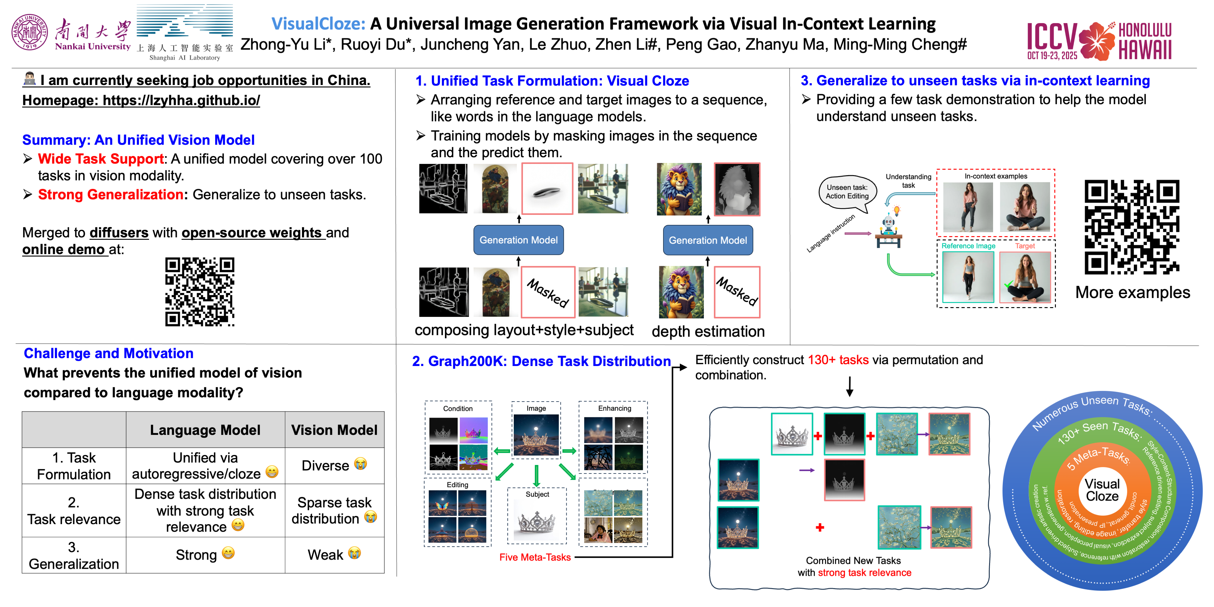 Recent advances in diffusion models have significantly advanced image generation; however, existing models remain task-specific, limiting their efficiency and generalizability. While universal models attempt to address these limitations, they face critical challenges, including generalizable instruction design, appropriate task distributions, and unified architectural design. In this work, we propose VisualCloze, a universal image generation framework, to tackle these challenges. Unlike existing methods that rely on language-based task descriptions, leading to task ambiguity and weak generalization, we integrate visual in-context learning, allowing models to identify tasks from demonstrations. Meanwhile, the inherent sparsity of visual task distributions hampers the learning of transferable knowledge across tasks. To this end, we introduce Graph200K, a graph-structured dataset that establishes various interrelated tasks, enhancing task density and knowledge transfer. Furthermore, we uncover an intrinsic alignment between image infilling and in-context learning, enabling us to leverage the strong generative priors of pre-trained infilling models without modifying their architectures. Experiments demonstrate that VisualCloze achieves strong performance across more than 100 in-domain tasks while generalizing to unseen tasks in few-shot and zero-shot settings.