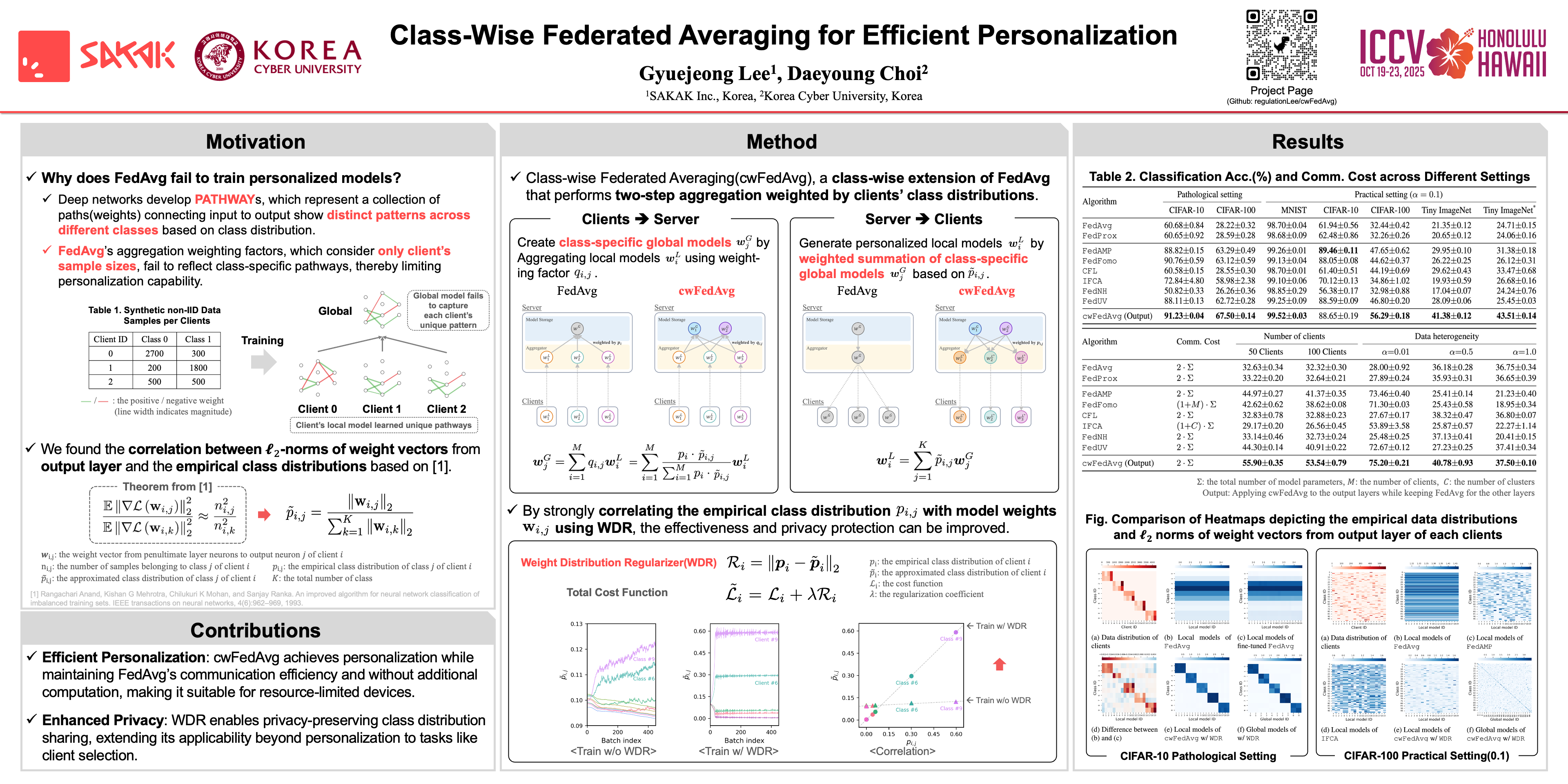 Federated learning (FL) enables collaborative model training across distributed clients without centralizing data. However, existing approaches like Federated Averaging ($\texttt{FedAvg}$) often perform poorly with heterogeneous data distributions, failing to achieve personalization due to their inability to capture class-specific information effectively.To overcome $\texttt{FedAvg}$'s personalization limitations, we propose Class-wise Federated Averaging ($\texttt{cwFedAvg}$), a novel personalized FL (PFL) framework that performs Federated Averaging for each class.$\texttt{cwFedAvg}$ creates class-specific global models via weighted aggregation of local models using class distributions, then combines them to generate personalized local models.To facilitate effective class-wise aggregation, we further propose Weight Distribution Regularizer ($\texttt{WDR}$), which encourages deep networks to encode class-specific information efficiently by aligning empirical and approximated class distributions derived from output layer weights.Our experiments demonstrate $\texttt{cwFedAvg}$'s superior performance over existing PFL methods through efficient personalization while maintaining $\texttt{FedAvg}$'s communication cost and avoiding additional local training and pairwise computations.