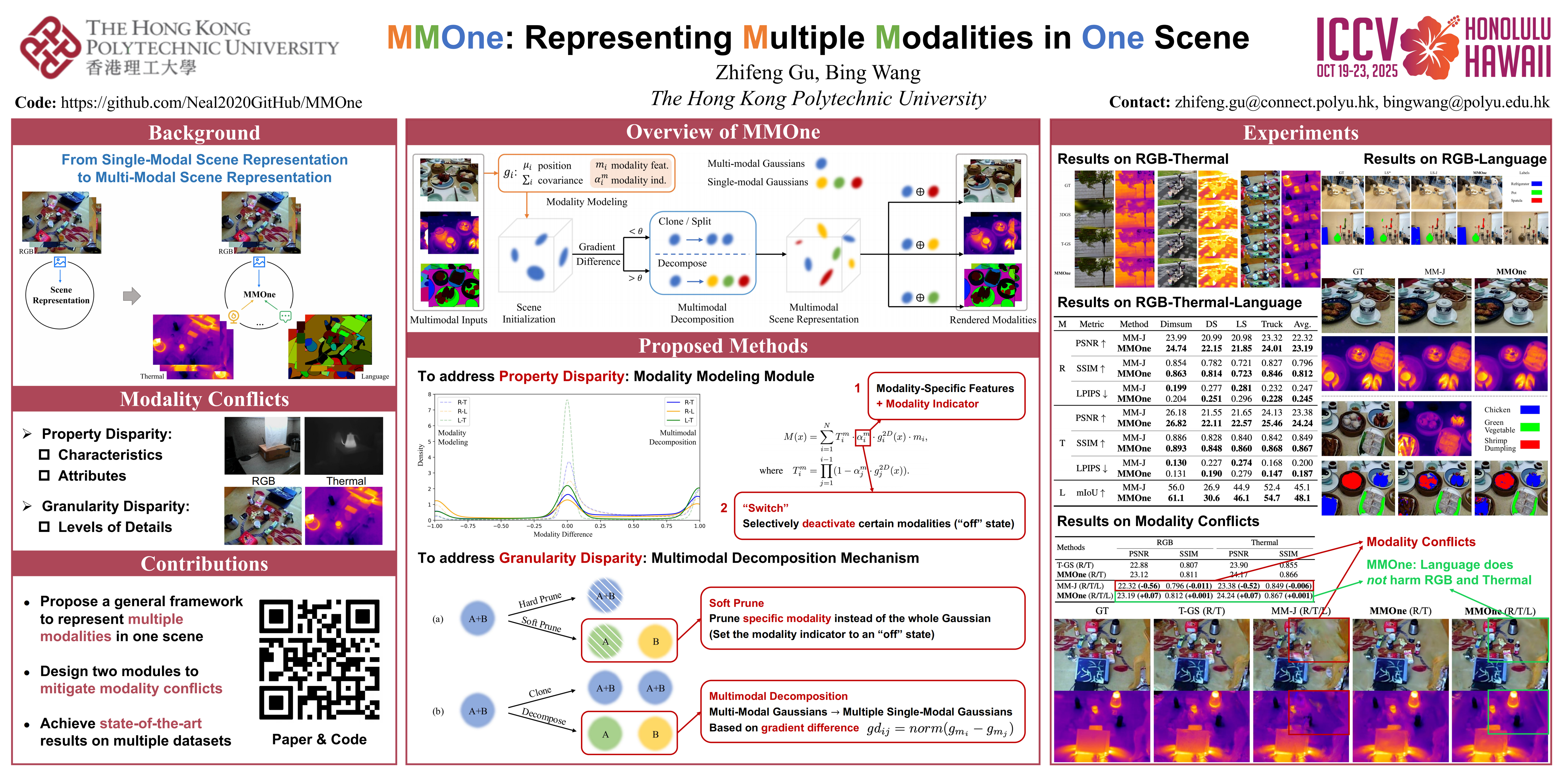 Humans perceive the world through multimodal cues to understand and interact with the environment. Learning a scene presentation for multiple modalities enhances comprehension of the physical world. However, modality conflicts, arising from inherent distinctions among different modalities, present two critical challenges: property disparity and granularity disparity. To address these challenges, we propose a general framework, MMOne, to represent multiple modalities in one scene, which can be readily extended to additional modalities. Specifically, a modality modeling module with a novel modality indicator is proposed to capture the unique properties of each modality. Additionally, we design a multimodal decomposition mechanism to separate multi-modal Gaussians into single-modal Gaussians based on modality differences. We address the essential distinctions among modalities by disentangling multimodal information into shared and modality-specific components, resulting in a more compact and efficient multimodal scene representation. Extensive experiments demonstrate that our method consistently enhances the representation capability for each modality and is scalable to additional modalities. The code will be released.