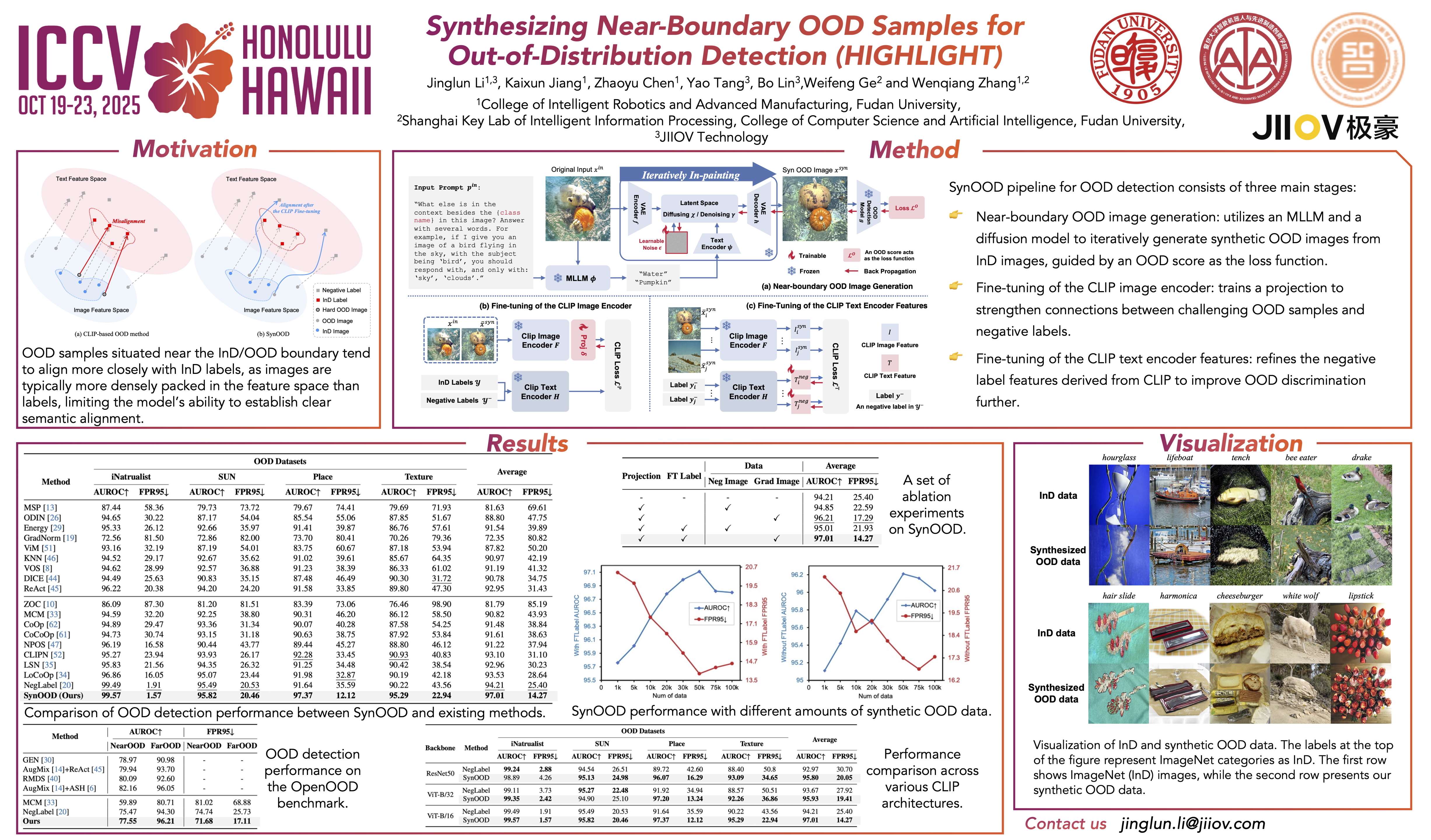 Pre-trained vision-language models have exhibited remarkable abilities in detecting out-of-distribution (OOD) samples. However, some challenging OOD samples, which lie close to in-distribution (InD) data in image feature space, can still lead to misclassification. The emergence of foundation models like diffusion models and multimodal large language models (MLLMs) offers a potential solution to this issue. In this work, we propose SynOOD, a novel approach that harnesses foundation models to generate synthetic, challenging OOD data for fine-tuning CLIP models, thereby enhancing boundary-level discrimination between InD and OOD samples. Our method uses an iterative in-painting process guided by contextual prompts from MLLMs to produce nuanced, boundary-aligned OOD samples. These samples are refined through noise adjustments based on gradients from OOD scores like the energy score, effectively sampling from the InD/OOD boundary. With these carefully synthesized images, we fine-tune the CLIP image encoder and negative label features derived from the text encoder to strengthen connections between near-boundary OOD samples and a set of negative labels. Finally, SynOOD achieves state-of-the-art performance on the large-scale ImageNet benchmark, with minimal increases in parameters and runtime. Our approach significantly surpasses existing methods, improving AUROC by 2.80% and reducing FPR95 by 11.13%. The code for SynOOD will be made publicly available.