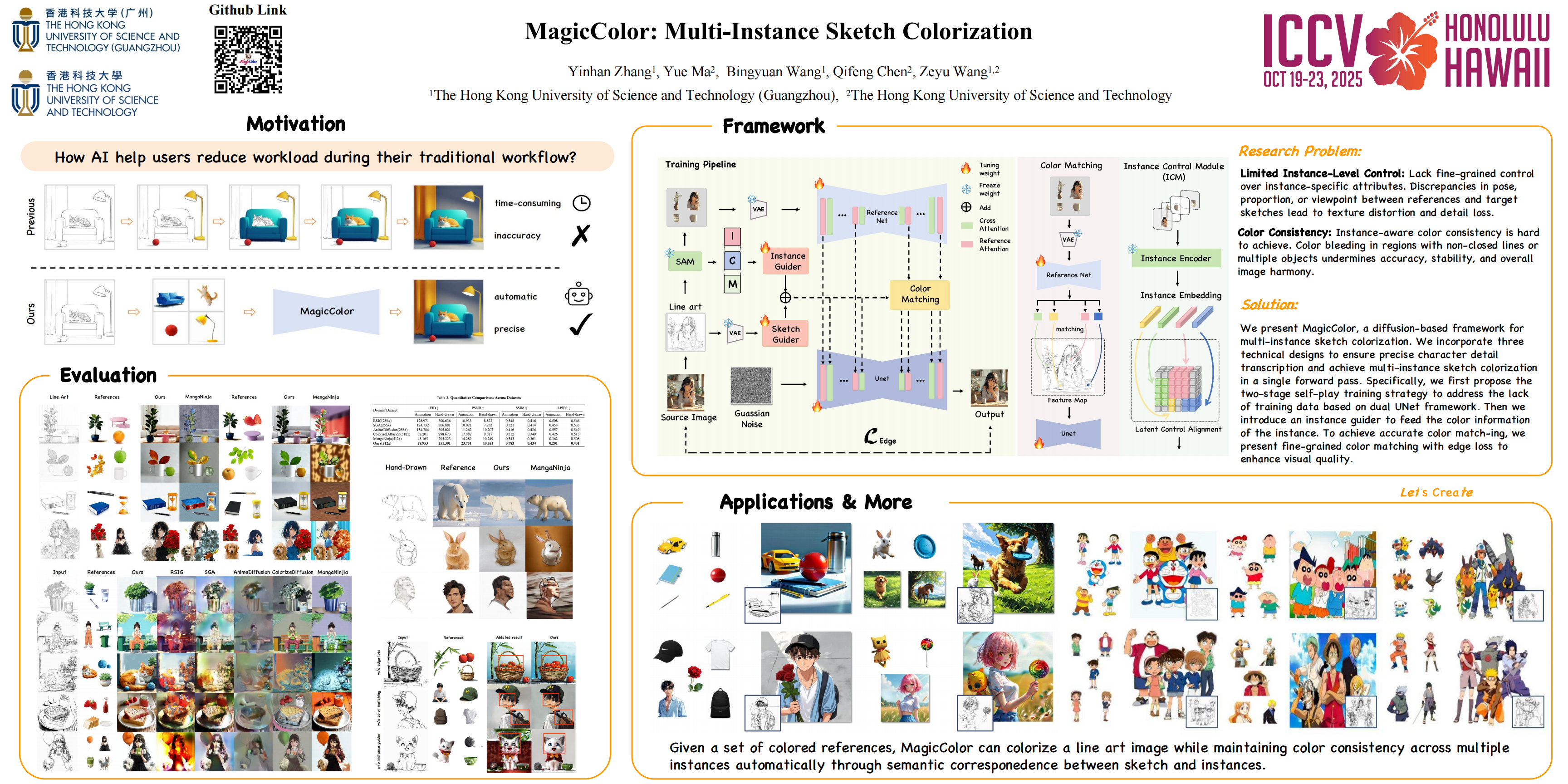 We present MagicColor, a diffusion-based framework for multi-instance sketch colorization. The production of multi-instance 2D line art colorization adheres to an industry-standard workflow, which consists of three crucial stages: the design of line art characters, the coloring of individual objects, and the refinement process. The artists are required to repeat the process to color each instance one by one, which is inaccurate and inefficient. Meanwhile, current generative methods fail to solve this task due to the challenge of multi-instance pair data collection. To tackle these challenges, we incorporate three technical designs to ensure precise character detail transcription and achieve multi-instance sketch colorization in a single forward. Specifically, we first propose the self-play training strategy to solve the lack of training data. Then the instance guider is introduced to feed the color of the instance. To achieve accurate color matching, we present the fine-grained color matching with edge loss to enhance visual quality. Equipped with the proposed module, MagicColor enables automatically transforming sketches into vividly-colored animations in accurate consistency with multi-reference characters.Experiments on a self-collected benchmark demonstrate the superiority of our model over current solutions in terms of precise colorization. Our model could even automate the colorization process, such that users can easily create a color consistent image by simply providing reference images as well as the original sketch. Our codes will be available soon.