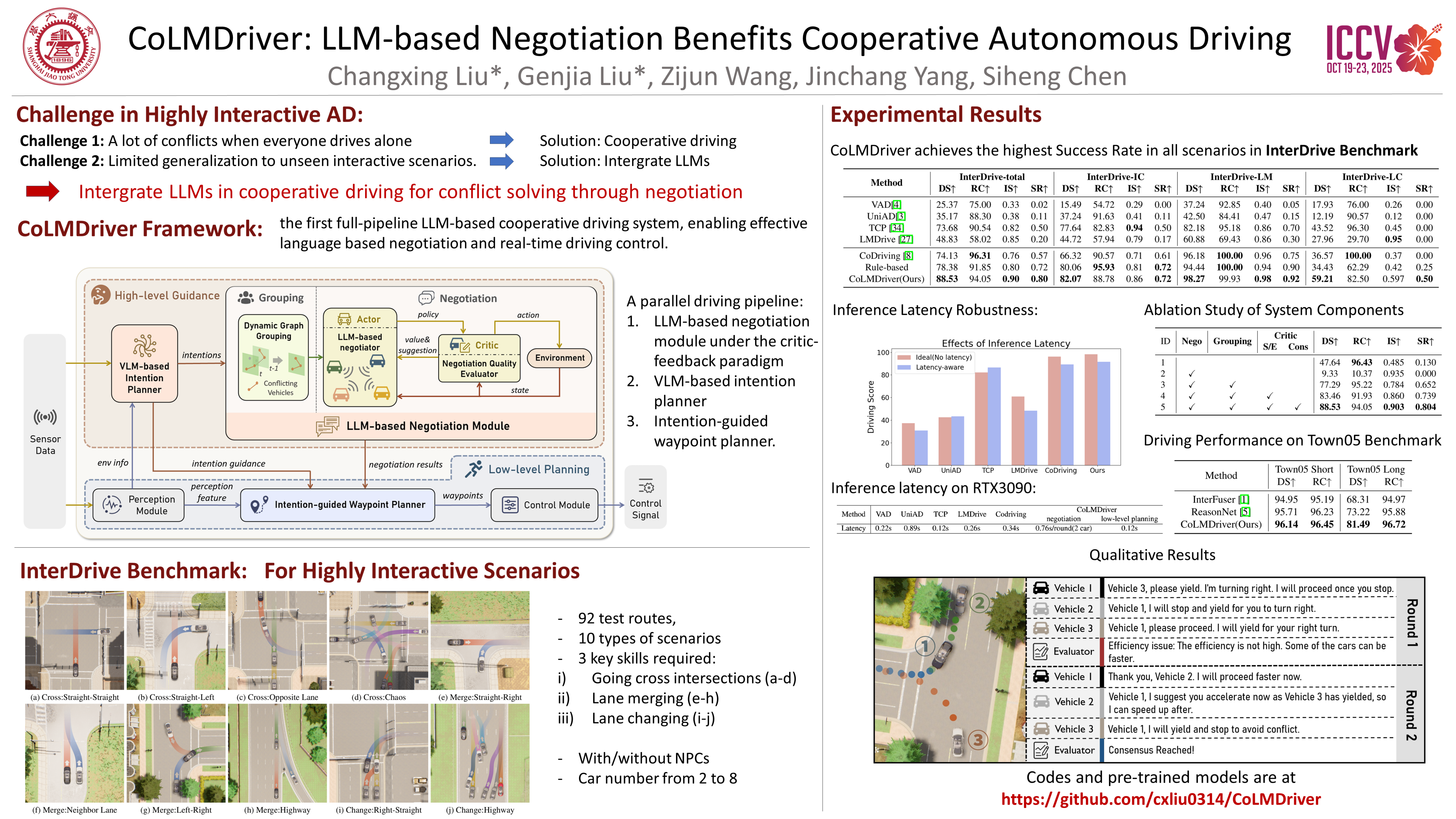 Vehicle-to-vehicle (V2V) cooperative autonomous driving holds great promise for improving safety by addressing the perception and prediction uncertainties inherent in single-agent systems. However, traditional cooperative methods are constrained by rigid collaboration protocols and limited generalization to unseen interactive scenarios. While LLM-based approaches offer generalized reasoning capabilities, their challenges in spatial planning and unstable inference latency hinder their direct application in cooperative driving. To address these limitations, we propose CoLMDriver, the first full-pipeline LLM-based cooperative driving system, enabling effective language-based negotiation and real-time driving control. CoLMDriver features a parallel driving pipeline with two key components: (i) an LLM-based negotiation module under an actor-critic paradigm, which continuously refines cooperation policies through feedback from previous decisions of all vehicles; and (ii) an intention-guided waypoint generator, which translates negotiation outcomes into executable waypoints. Additionally, we introduce InterDrive, a CARLA-based simulation benchmark comprising 10 challenging interactive driving scenarios for evaluating V2V cooperation. Experimental results demonstrate that CoLMDriver significantly outperforms existing approaches, achieving an 11% higher success rate across diverse highly interactive V2V driving scenarios. The code will be released.