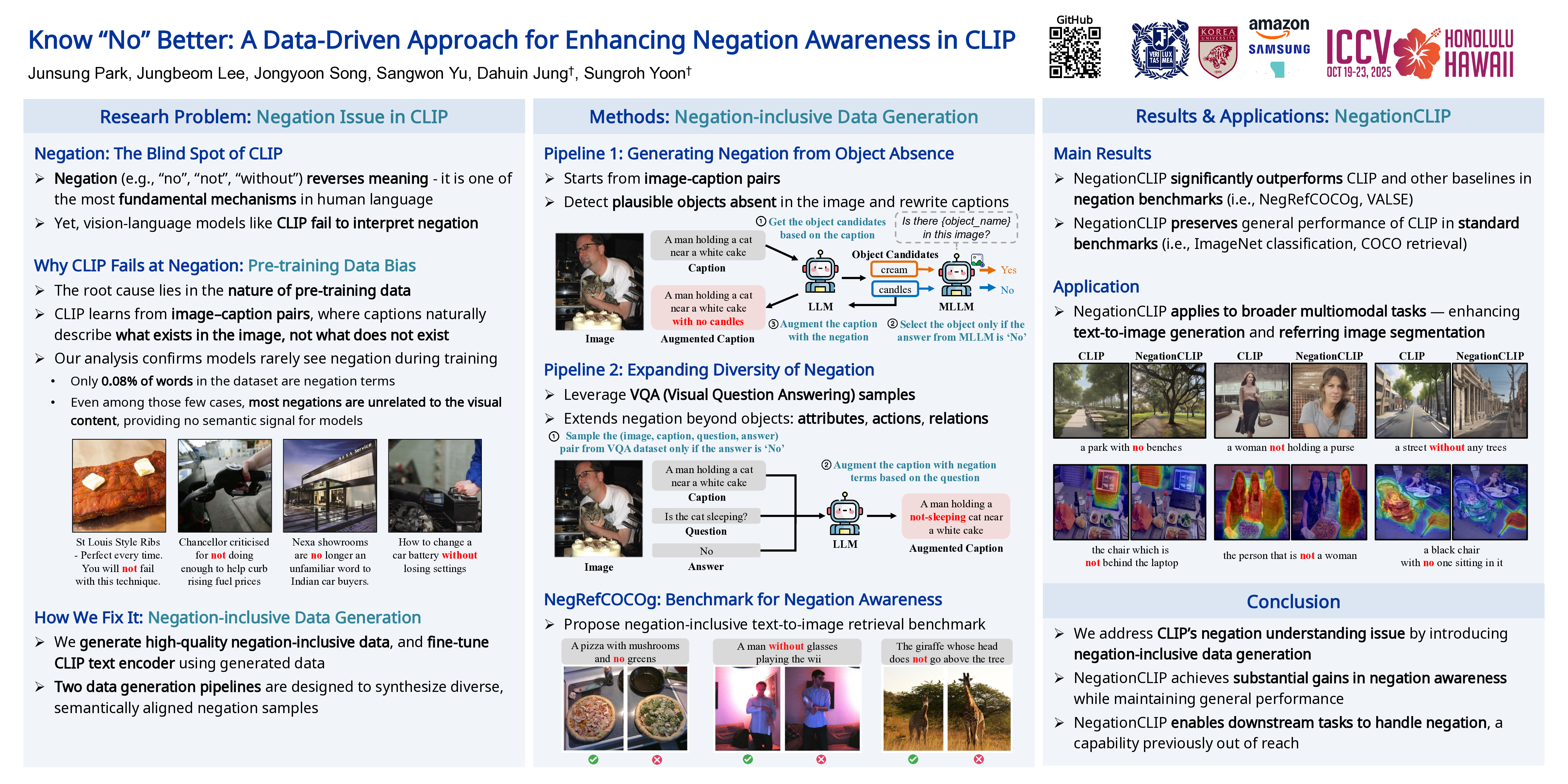 While CLIP has significantly advanced multimodal understanding by bridging vision and language, the inability to grasp negation — such as failing to differentiate concepts like "parking" from "no parking" — poses substantial challenges.By analyzing the data used in the public CLIP model's pre-training, we posit this limitation stems from a lack of negation-inclusive data.To address this, we introduce data generation pipelines that employ a large language model (LLM) and a multimodal LLM to produce negation-inclusive captions.Fine-tuning CLIP with data generated from our pipelines, we develop NegationCLIP, which enhances negation awareness while preserving the generality.Moreover, to enable a comprehensive evaluation of negation understanding, we propose NegRefCOCOg—a benchmark tailored to test VLMs' ability to interpret negation across diverse expressions and positions within a sentence.Experiments on various CLIP architectures validate the effectiveness of our data generation pipelines in enhancing CLIP's ability to perceive negation accurately.Additionally, NegationCLIP's enhanced negation awareness has practical applications across various multimodal tasks, demonstrated by performance gains in text-to-image generation and referring image segmentation.