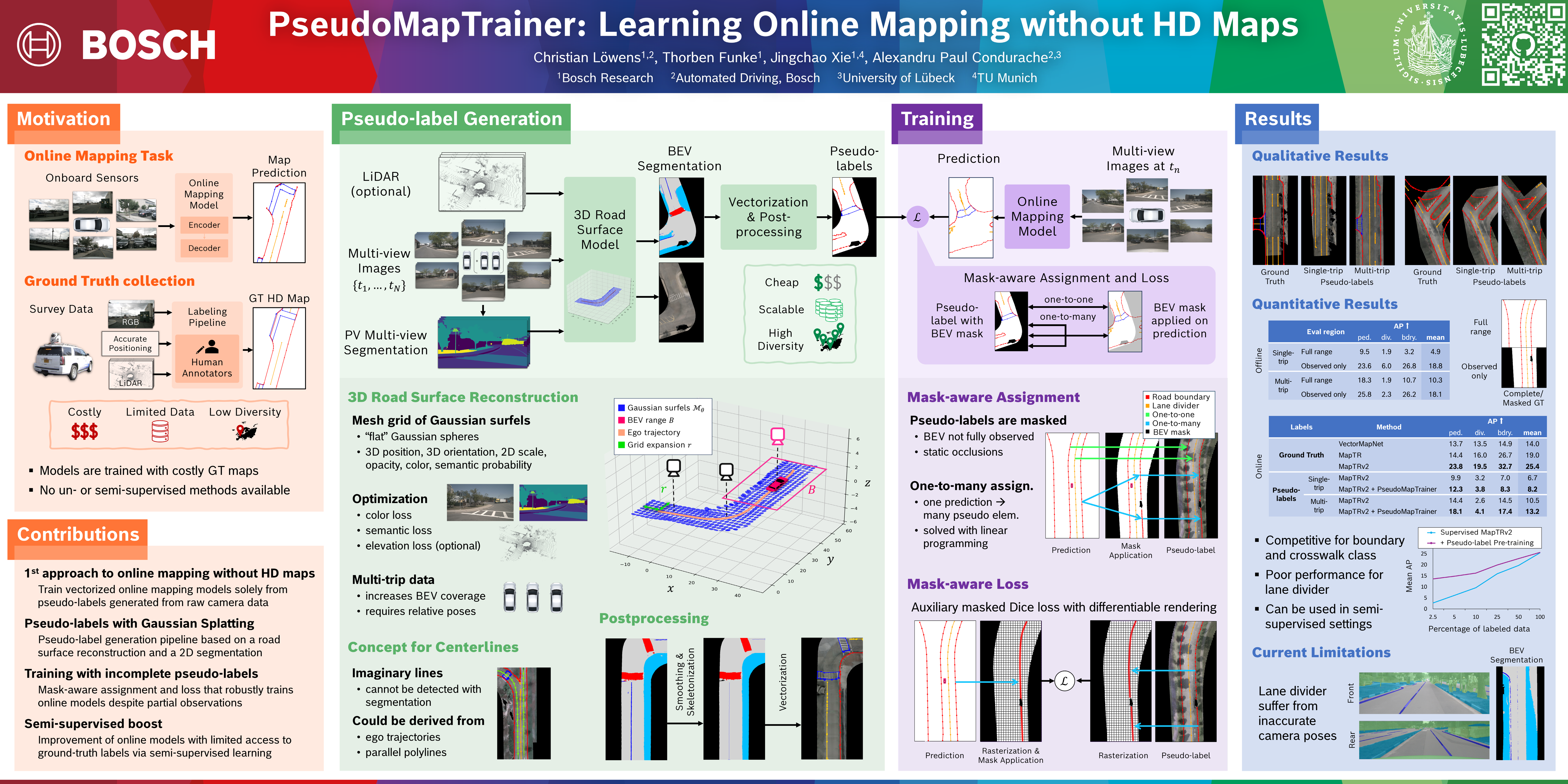 Online mapping approaches show remarkable results in predicting vectorized maps from multi-view camera images only. However, all existing approaches still rely on ground-truth high-definition maps during training, which are expensive to obtain and often not geographically diverse enough for reliable generalization. In this work, we propose PseudoMapTrainer, a novel approach to online mapping that uses pseudo labels generated from unlabeled sensor data. We derive those pseudo labels by reconstructing the road surface from multi-camera imagery using Gaussian splatting and semantics of a pre-trained 2D segmentation network. In addition, we introduce a mask-aware assignment algorithm and loss function to handle partially masked pseudo labels, allowing for the first time the training of online mapping models without any ground-truth maps. Furthermore, our pseudo labels can be effectively used to pre-train an online model in a semi-supervised manner to leverage large-scale unlabeled crowdsourced data. The code will be made publicly available.