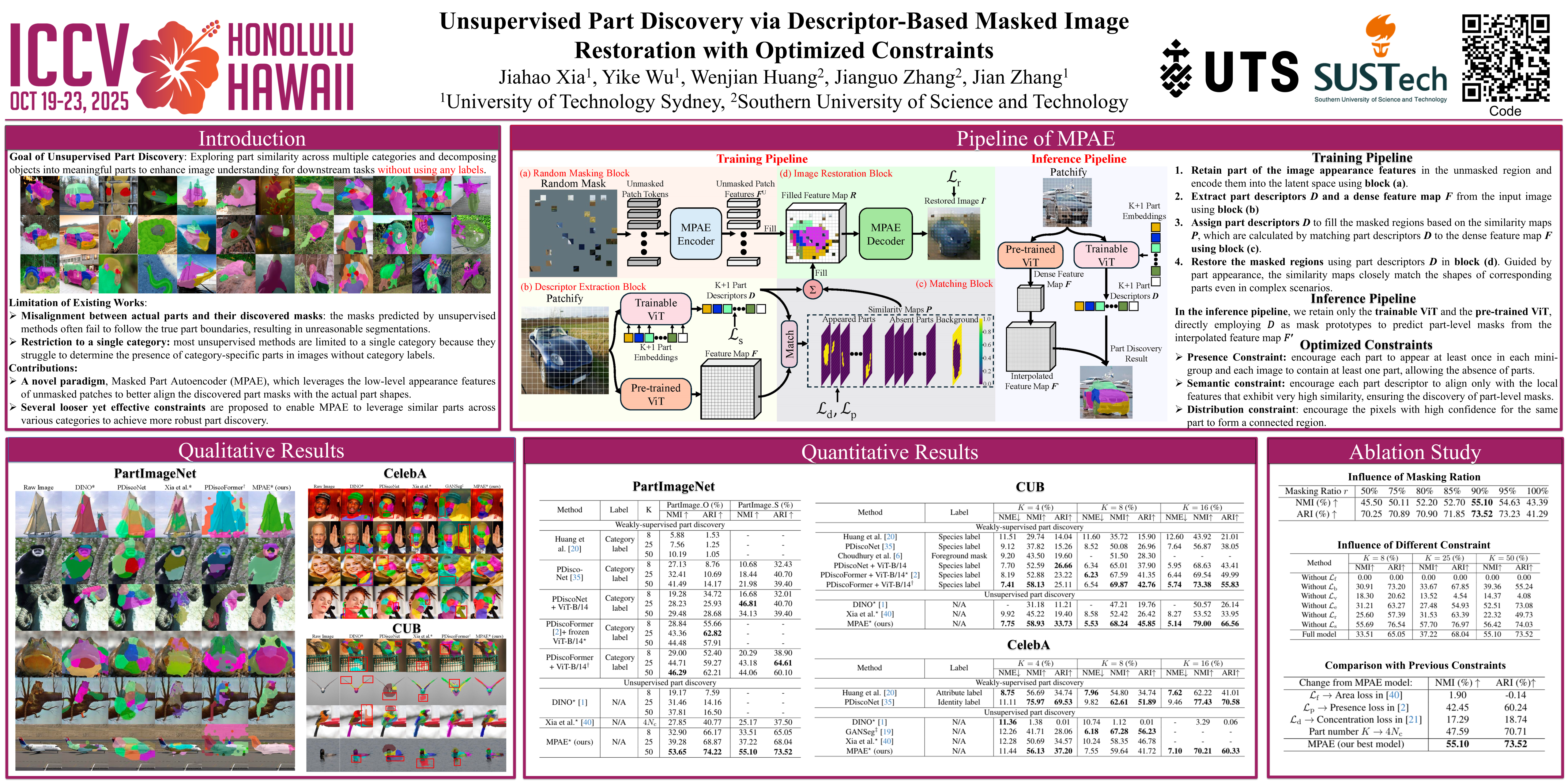 Unsupervised Part Discovery via Descriptor-Based Masked Image Restoration with Optimized Constraints