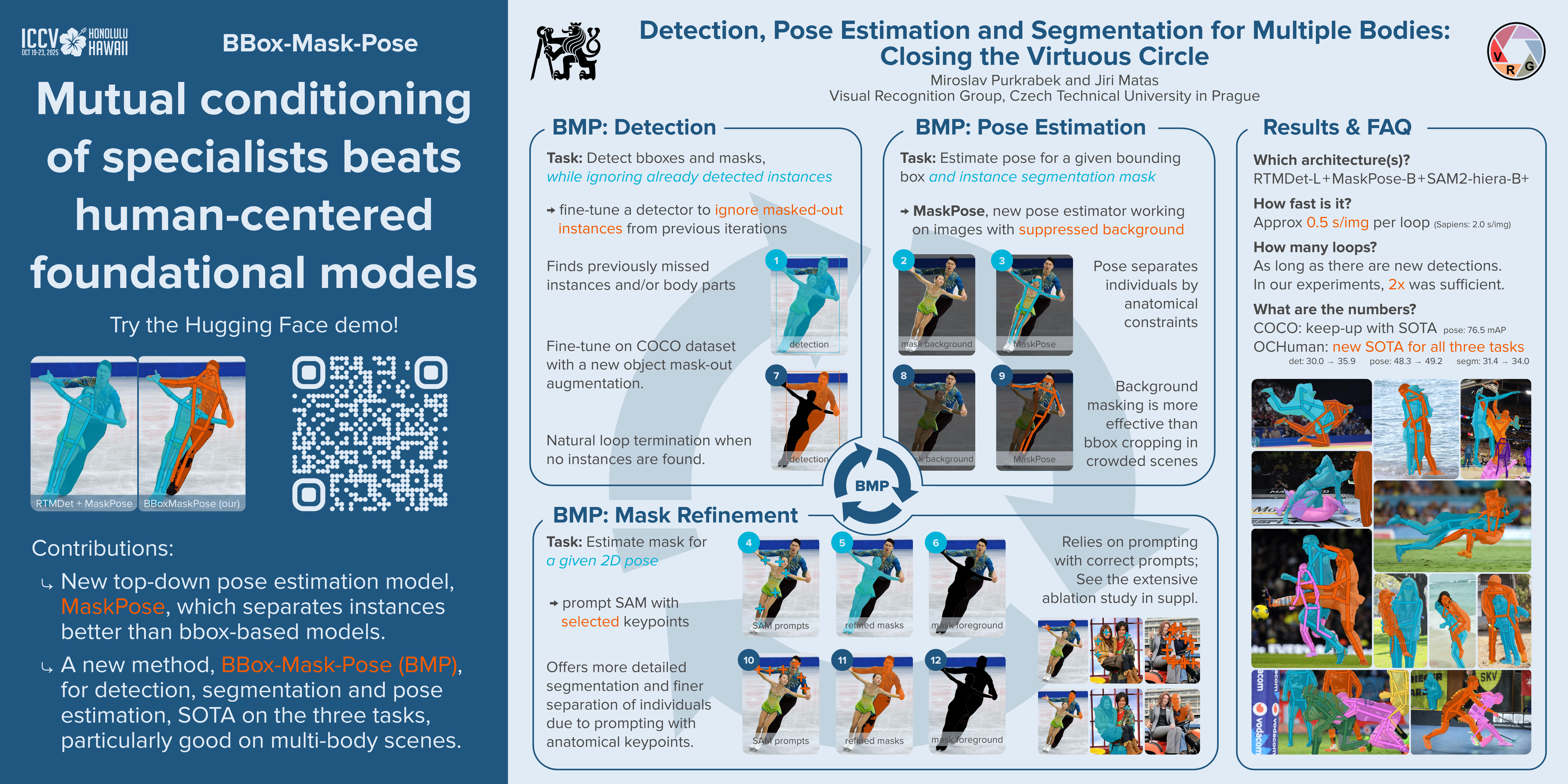 Human pose estimation methods work well on isolated people but struggle with multiple-bodies-in-proximity scenarios. Previous work has addressed this problem by conditioning pose estimation by detected bounding boxes or keypoints, but overlooked instance masks. We propose to iteratively enforce mutual consistency of bounding boxes, instance masks, and poses. The introduced BBox-Mask-Pose (BMP) method uses three specialized models that improve each other's output in a closed loop. All models are adapted for mutual conditioning, which improves robustness in multi-body scenes. MaskPose, a new mask-conditioned pose estimation model, is the best among top-down approaches on OCHuman. BBox-Mask-Pose pushes SOTA on OCHuman dataset in all three tasks -- detection, instance segmentation, and pose estimation. It also achieves SOTA performance on COCO pose estimation. The method is especially good in scenes with large instances overlap, where it improves detection by 39% over the baseline detector. With small specialized models and faster runtime, BMP is an effective alternative to large human-centered foundational models. Code and models will be published.