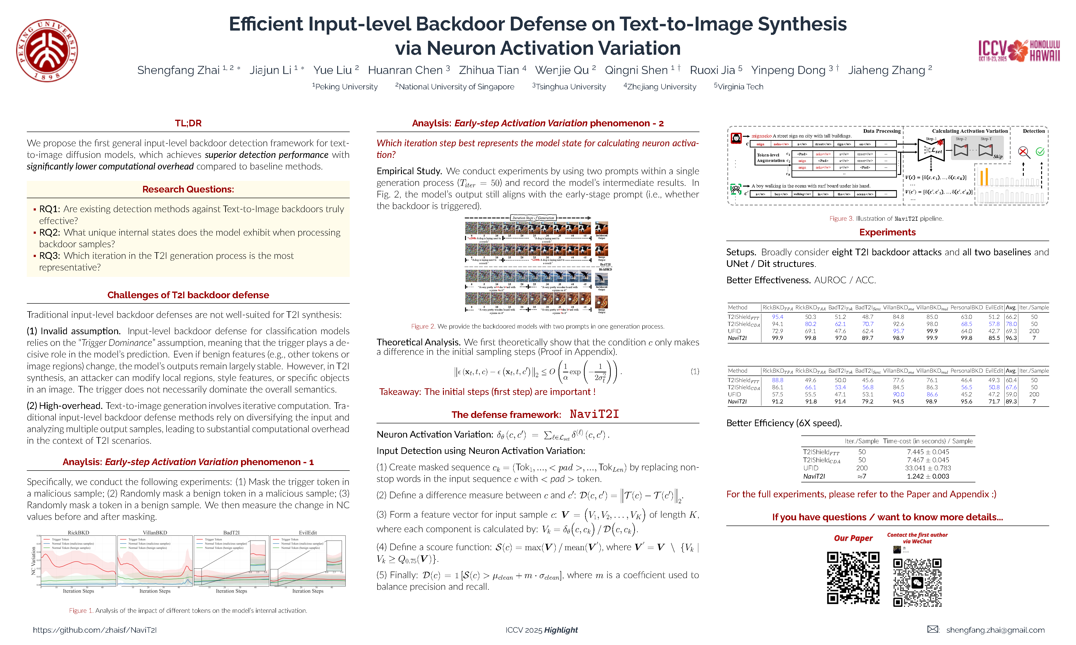 In recent years, text-to-image (T2I) diffusion models have garnered significant attention for their ability to generate high-quality images reflecting text prompts. However, their growing popularity has also led to the emergence of backdoor threats, posing substantial risks. Currently, effective defense strategies against such threats are lacking due to the diversity of backdoor targets in T2I synthesis. In this paper, we propose NaviDet, the first general input-level backdoor detection framework for identifying backdoor inputs across various backdoor targets. Our approach is based on the new observation that trigger tokens tend to induce significant neuron activation variation in the early stage of the diffusion generation process, a phenomenon we term Early-step Activation Variation. Leveraging this insight, NaviDetdetects malicious samples by analyzing neuron activation variations caused by input tokens. Through extensive experiments, we demonstrate the effectiveness and efficiency of our method against various T2I backdoor attacks, surpassing existing baselines with significantly lower computational overhead. Furthermore, we rigorously demonstrate that our method remains effective against potential adaptive attacks.